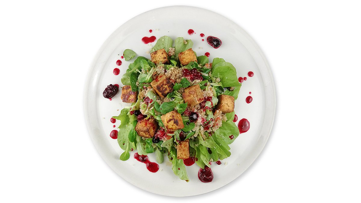 Kinoa, tofu, matovilac, soya sos, orah, zelena salata, konkase paradajz, susamovo ulje, pirinčano sirće, preliv šumsko voće
