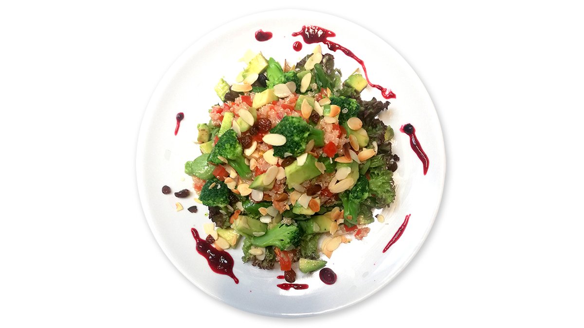 Kinoa, matovilac, brokoli, miks zelena salata, flambirane grožđice, badem, konkase paradajz