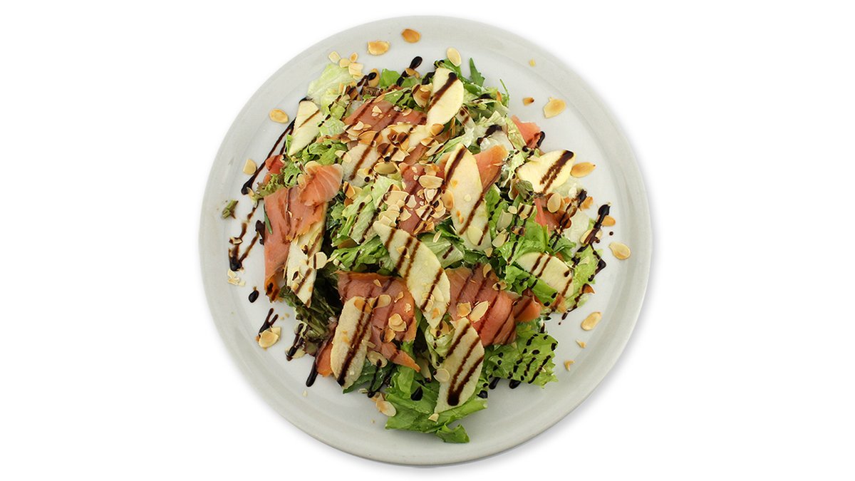 Mix zelenih salata, rukola, listići badema, redukovani aceto, jabuka, susam dresing, krutoni, susam, posni majonez