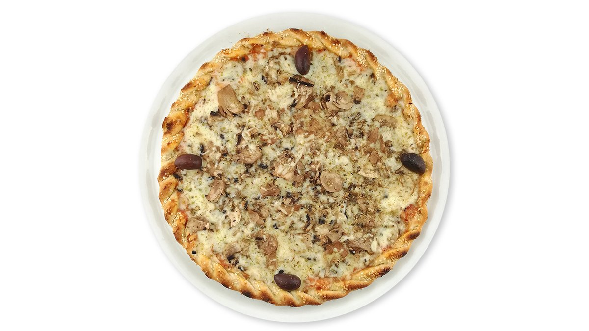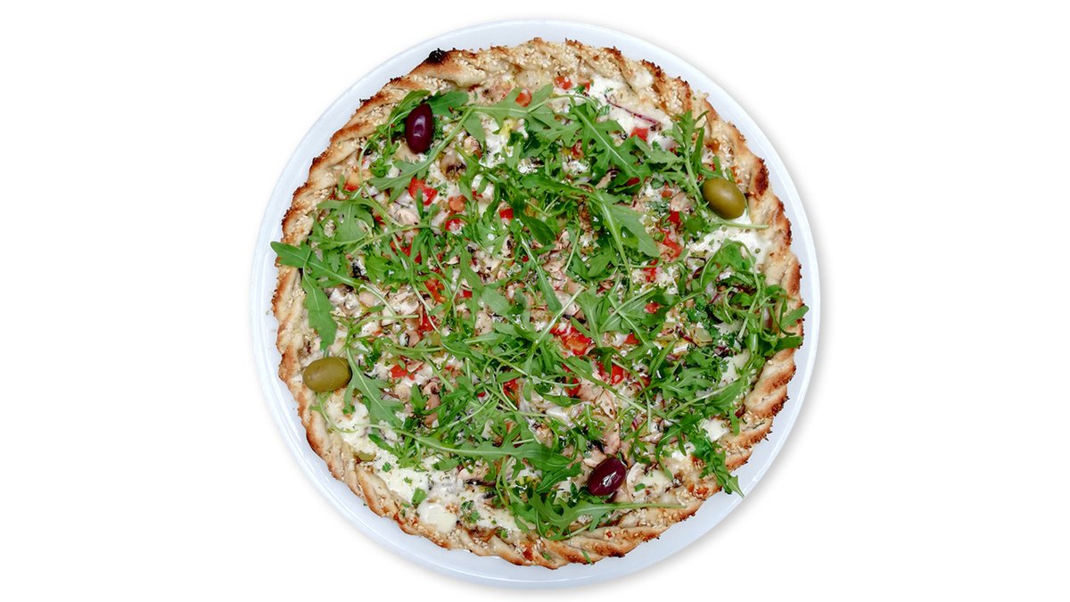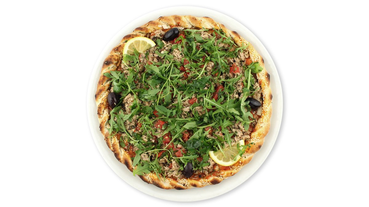 Pelat, šampinjoni, tunjevina, beli luk, rukola, masline, inćuni, maslinovo ulje, paradajz, limun