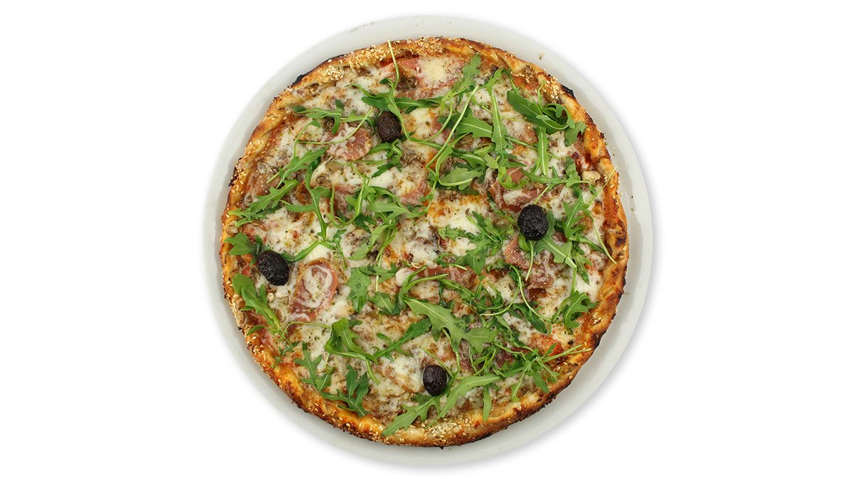 Pelat, sir, šampinjoni, njeguški pršut, masline, parmezan, rukola