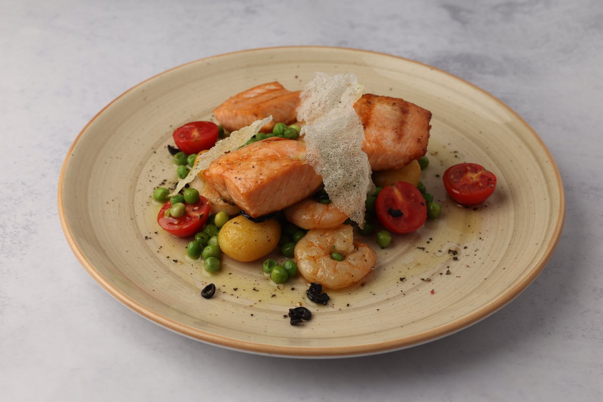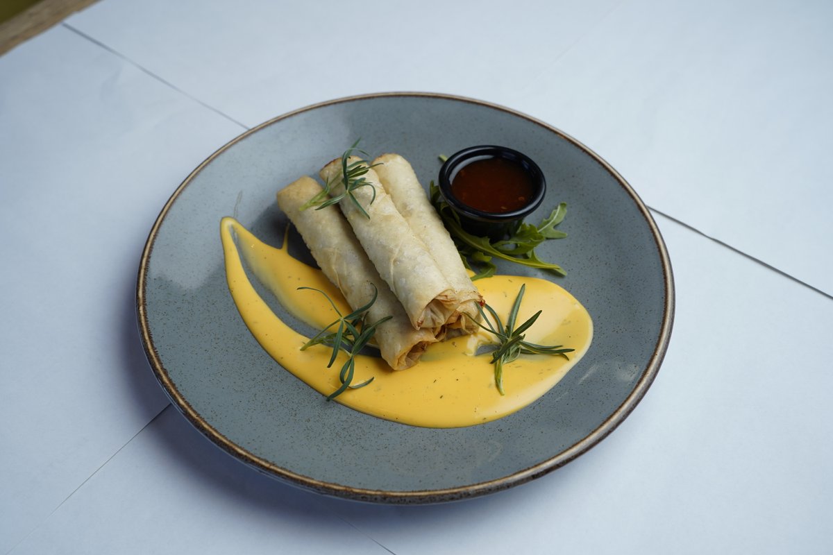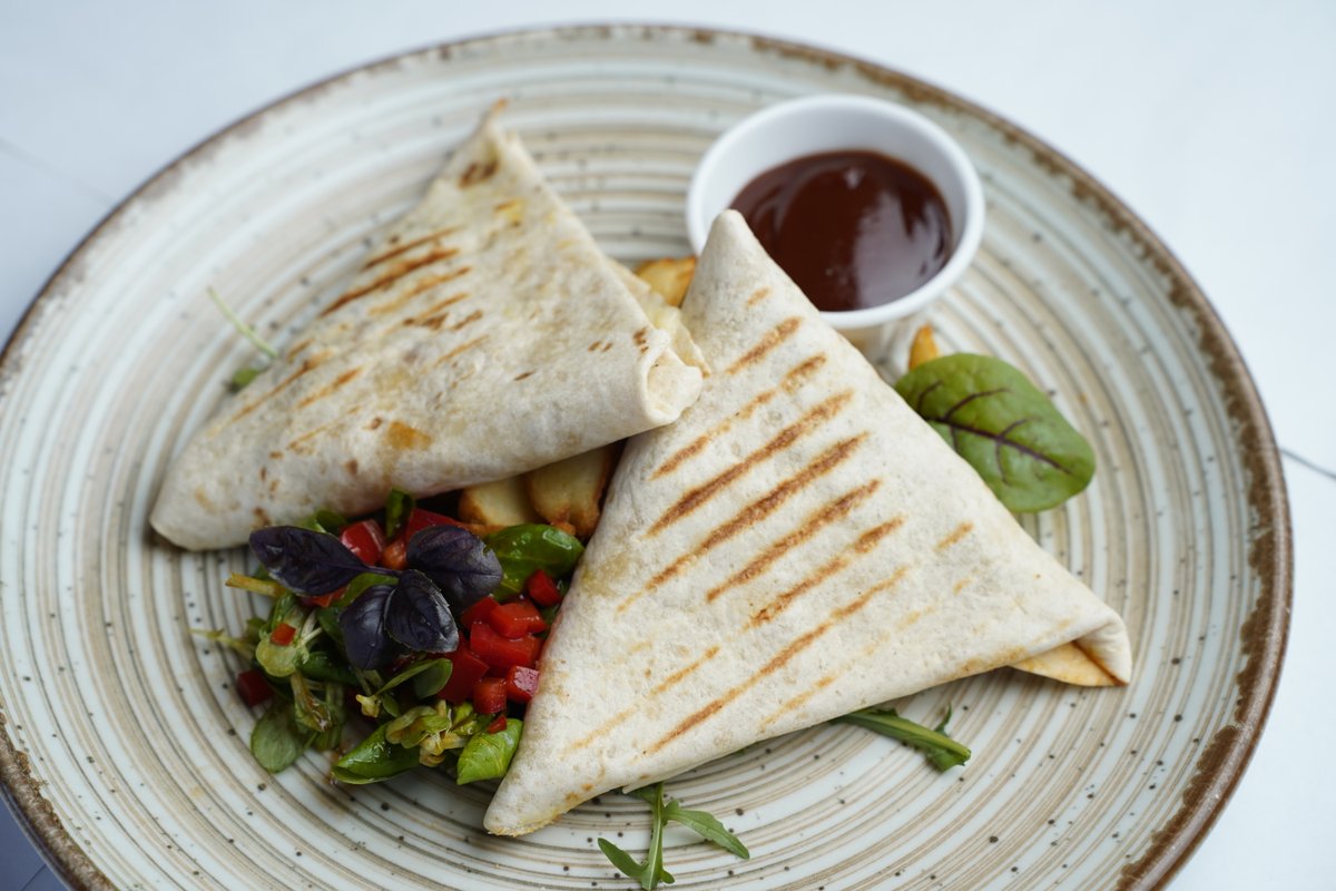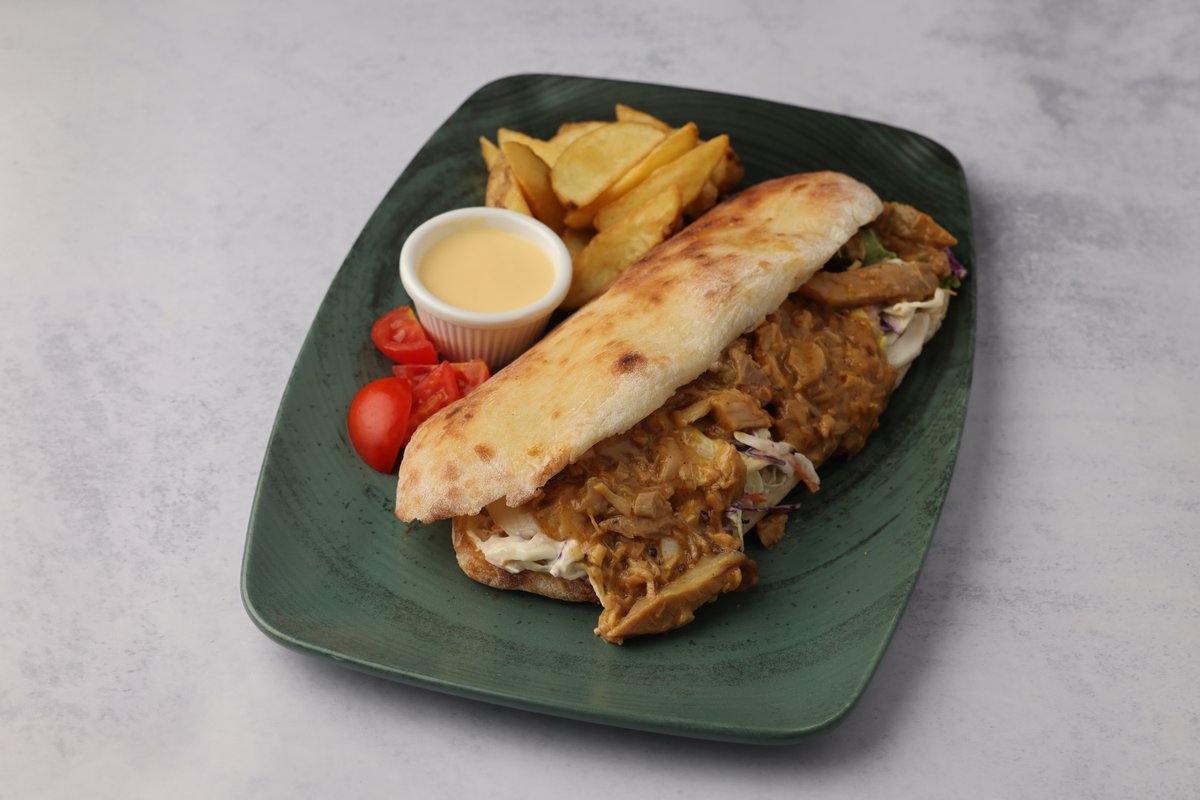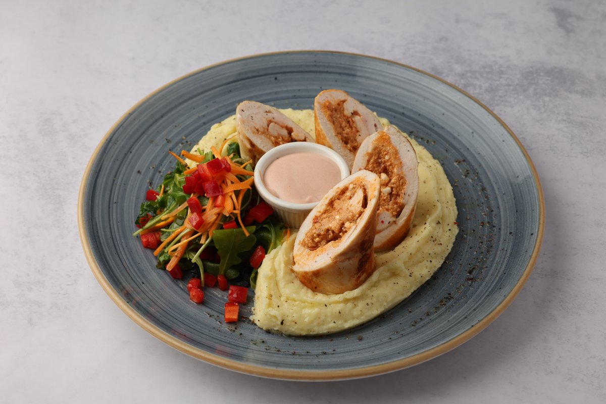 Prženice punjene pavlakom, ćurećim prsima i gauda sirom, pomfrit,čeri paradajz i ajvar dresing