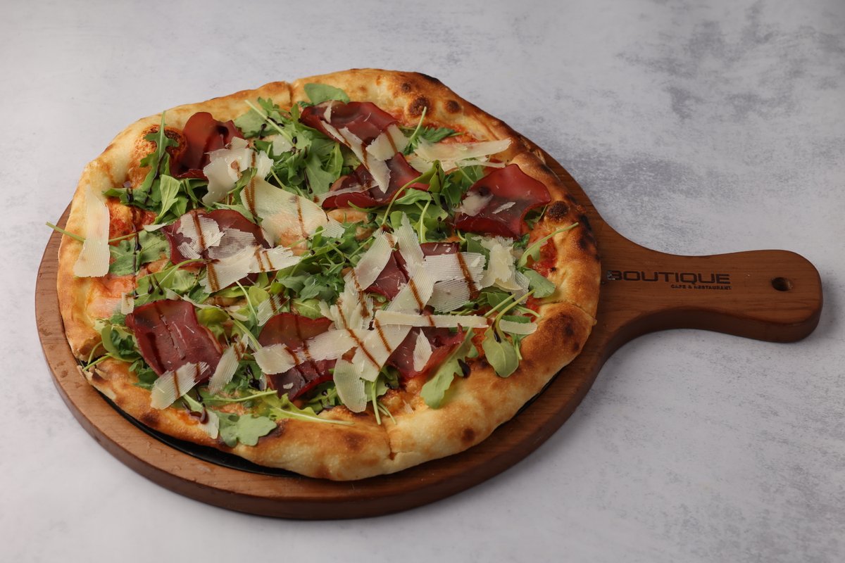 Pelat, mocarela, svinjska pršuta, rukola, parmezan, masline, 32 cm