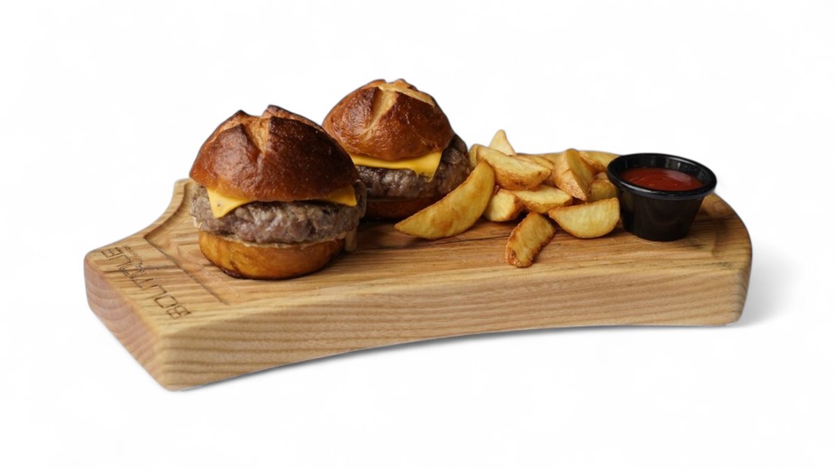 Tri mini juneća burgera svaki sa različitim dresingom: cezar, ranč i dresing na bazi tri majoneza. Čedar, pančeta, paradajz, prilog wedges krompirići