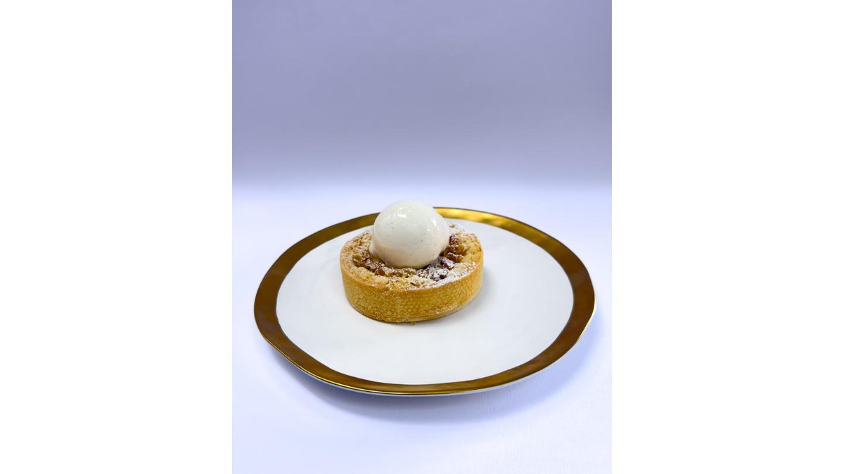 Prhko testo sa filom od karamelizovanih jabuka i začina, crumble od lešnika i cimeta. Šalje se bez sladoleda