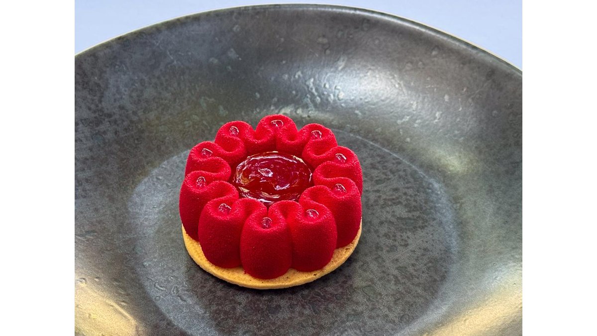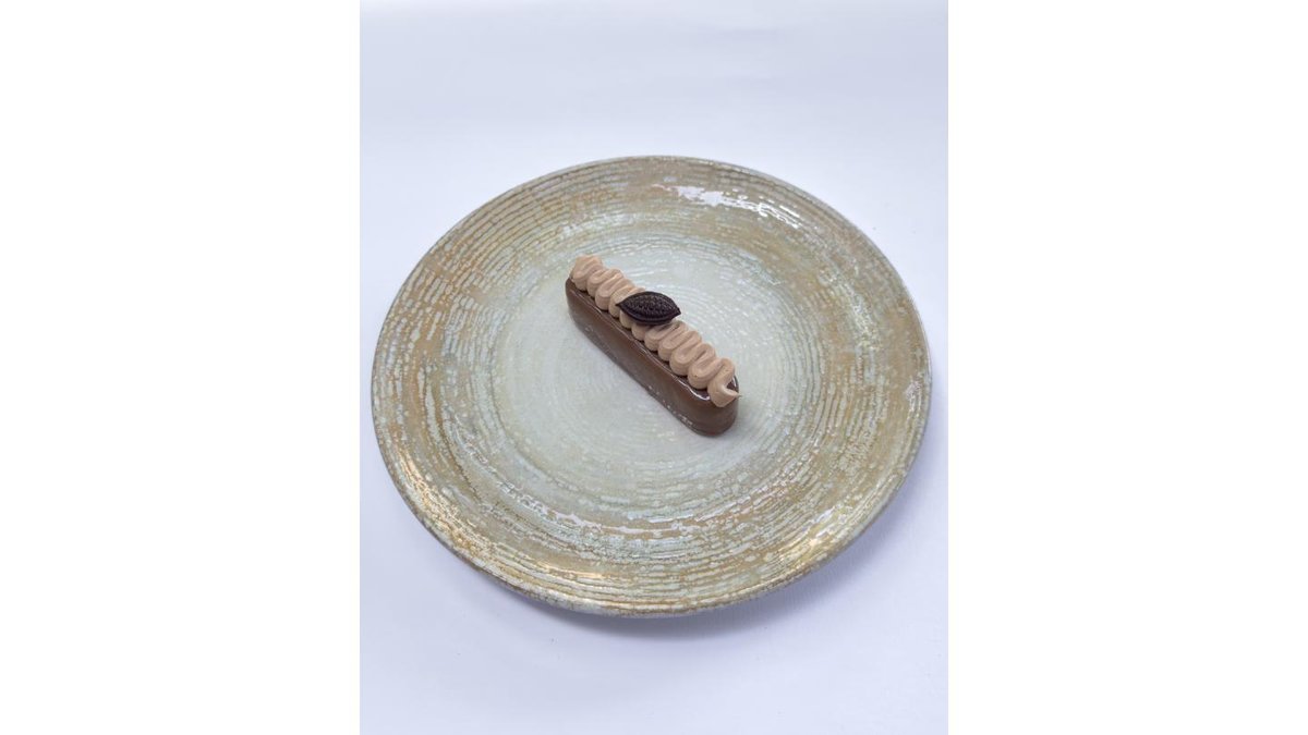 Hrskava korica od mlečne čokolade, lešnika i francuskog keksa, mousse od bele čokolade i mascarponea, cremeux od mlečne čokolade i lešnika, mlečna i bela glazura