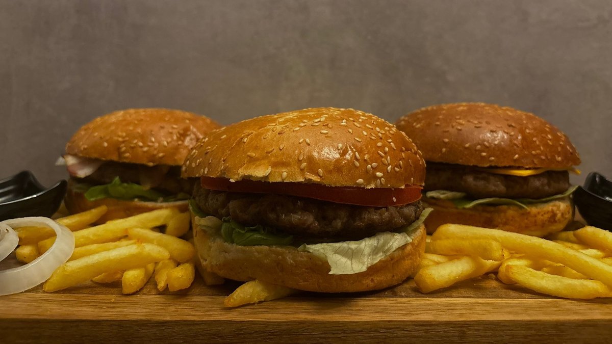 100% Juneće meso ,slanina ,cheddar sir kiseli krastavac, burger sos , luk, paradajz, ,ice - berg salata , pomfrit, piće.