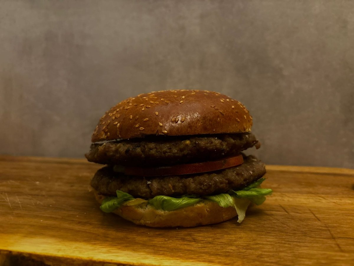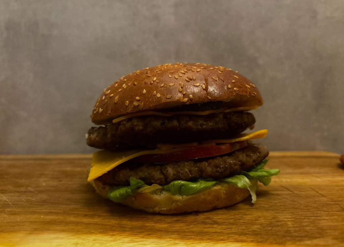 100% juneći burger x 2 , slanina, jaje, cheddar sir, luk, kiseli krastavac, burger sos , paradajz, ice berg salata