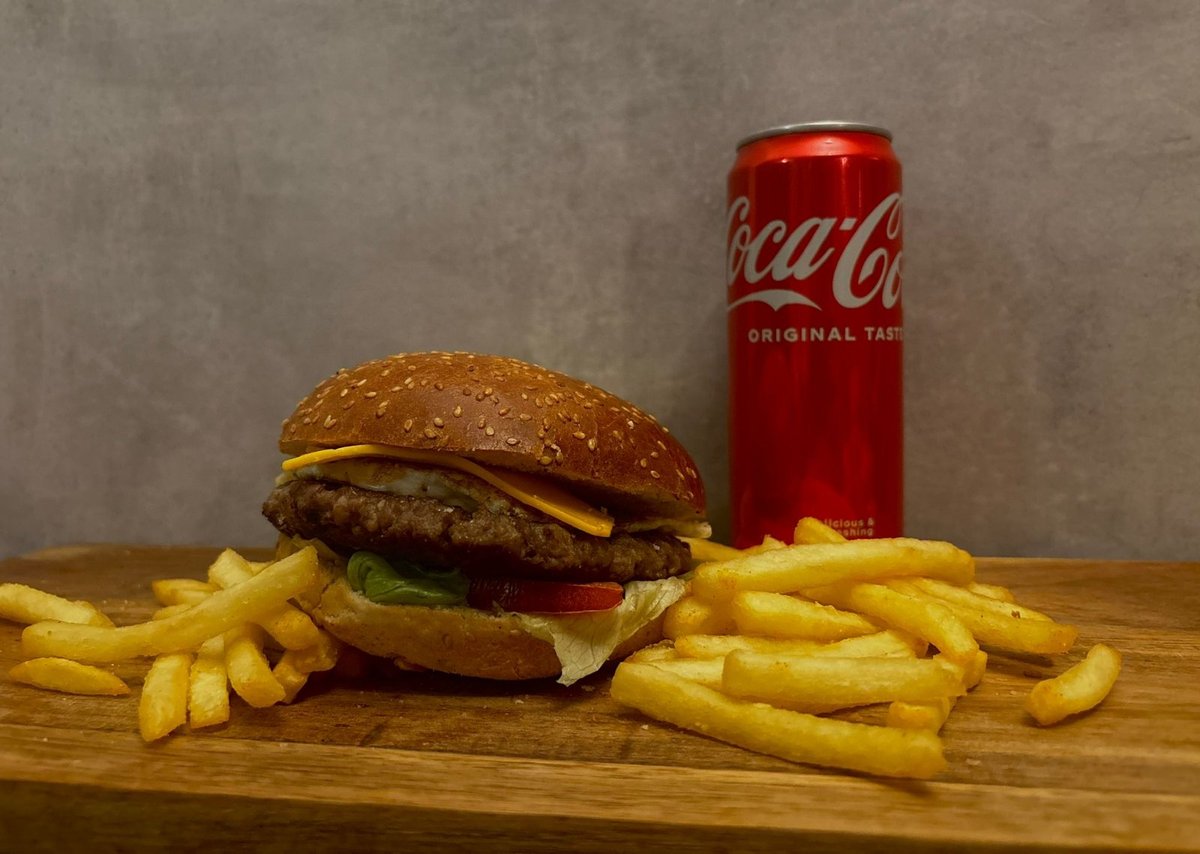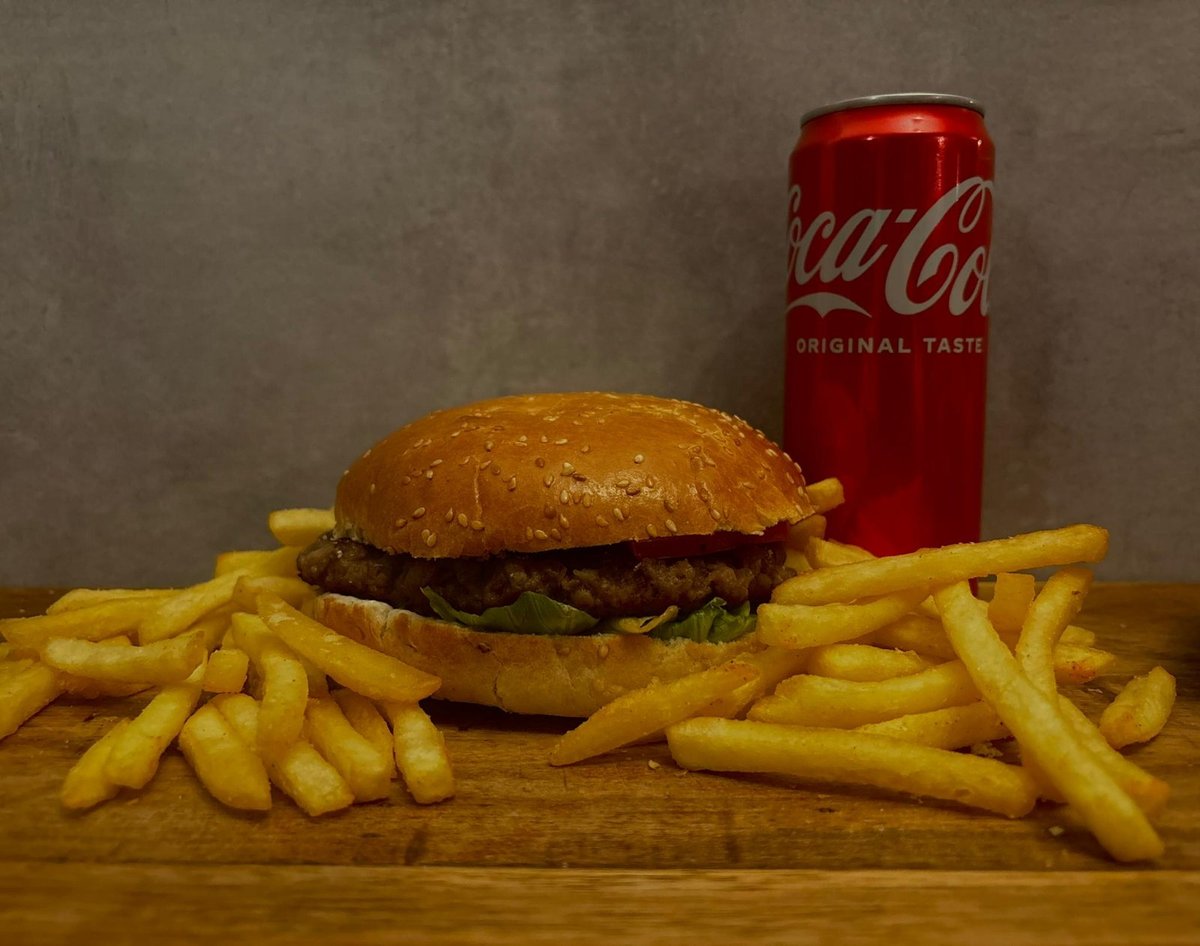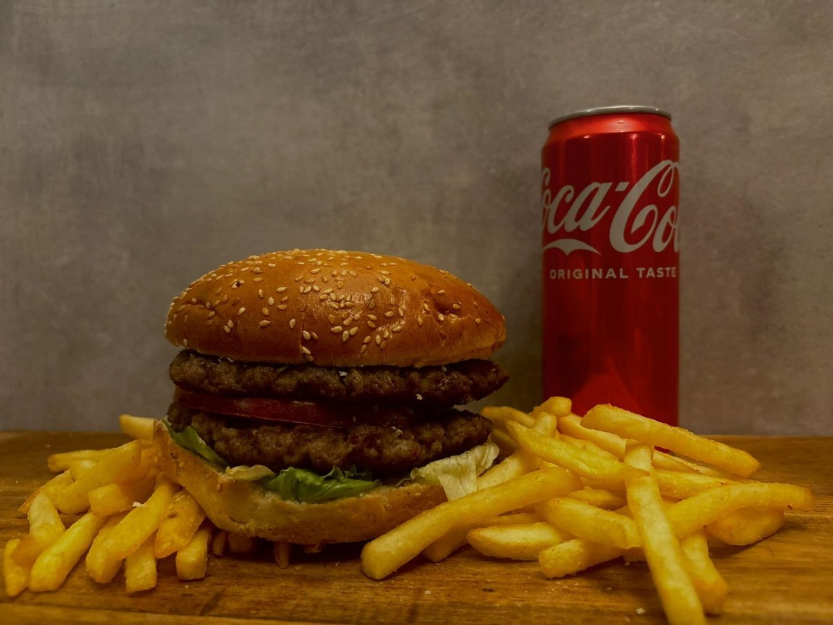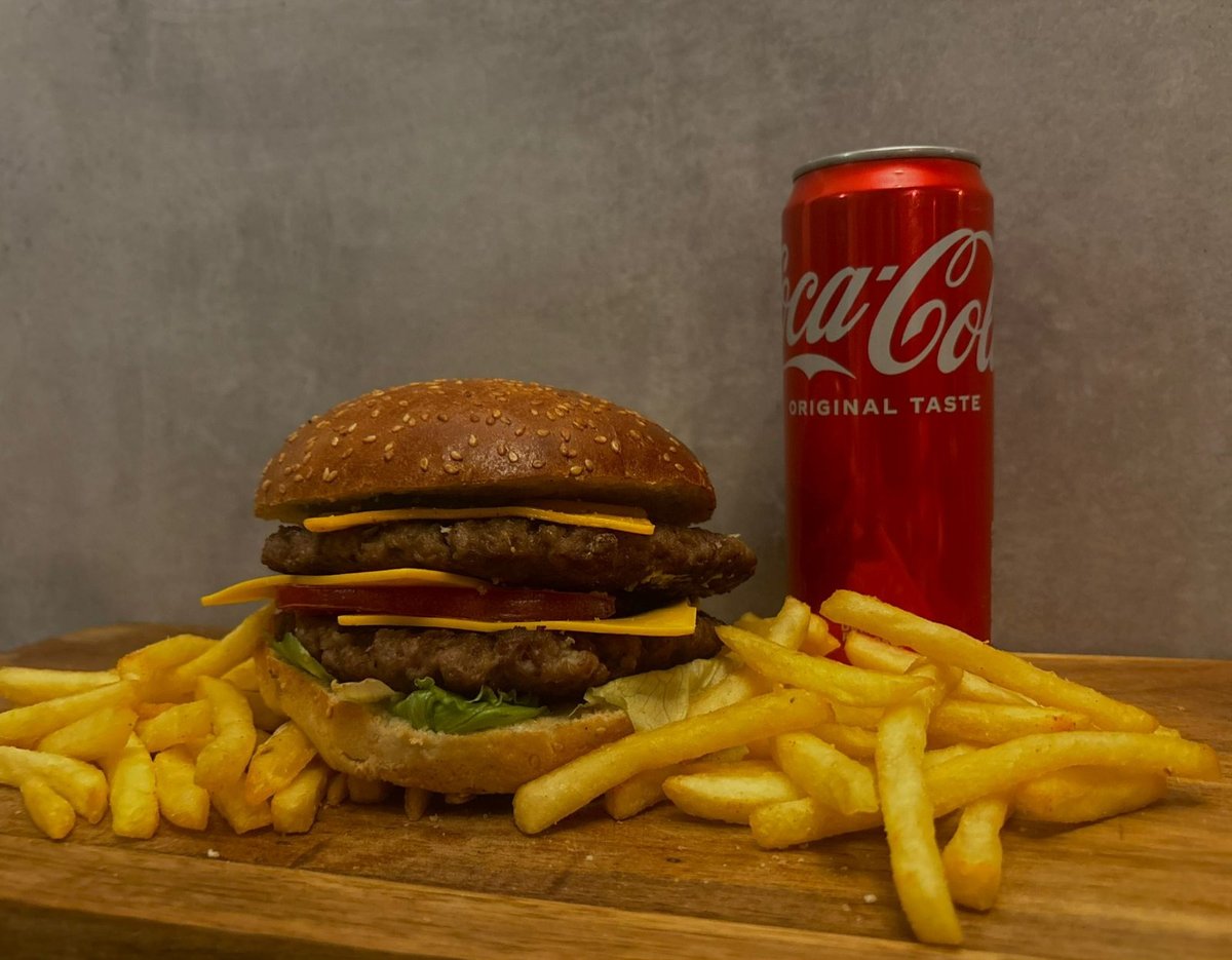 100% juneći burger × 2 , kiseli krastavac, burger sos , luk, paradajz, ice berg salata, pomfrit, piće