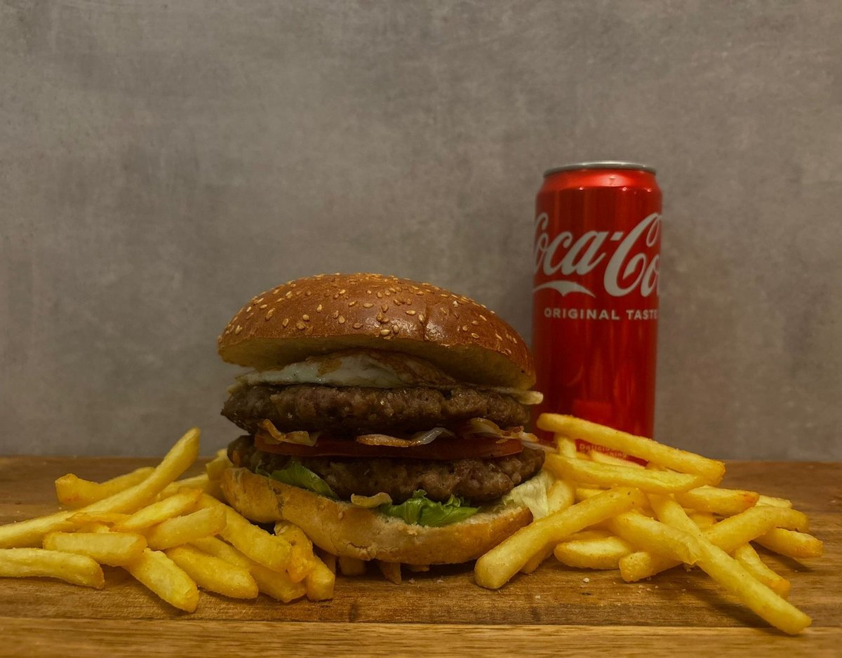 100% juneći burger x2 , slanina, jaje, cheddar sir, luk, kiseli krastavac, burger sos , paradajz, ice berg salata, pomfrit, piće