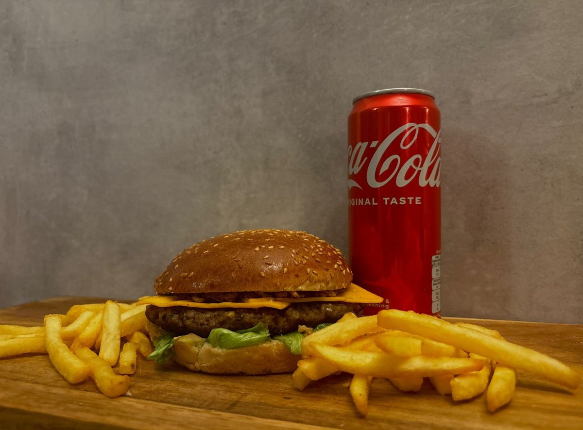 100% juneće meso ,kiseli krastavac, burger sos i, luk, paradajz, ice berg salata, pomfrit, piće