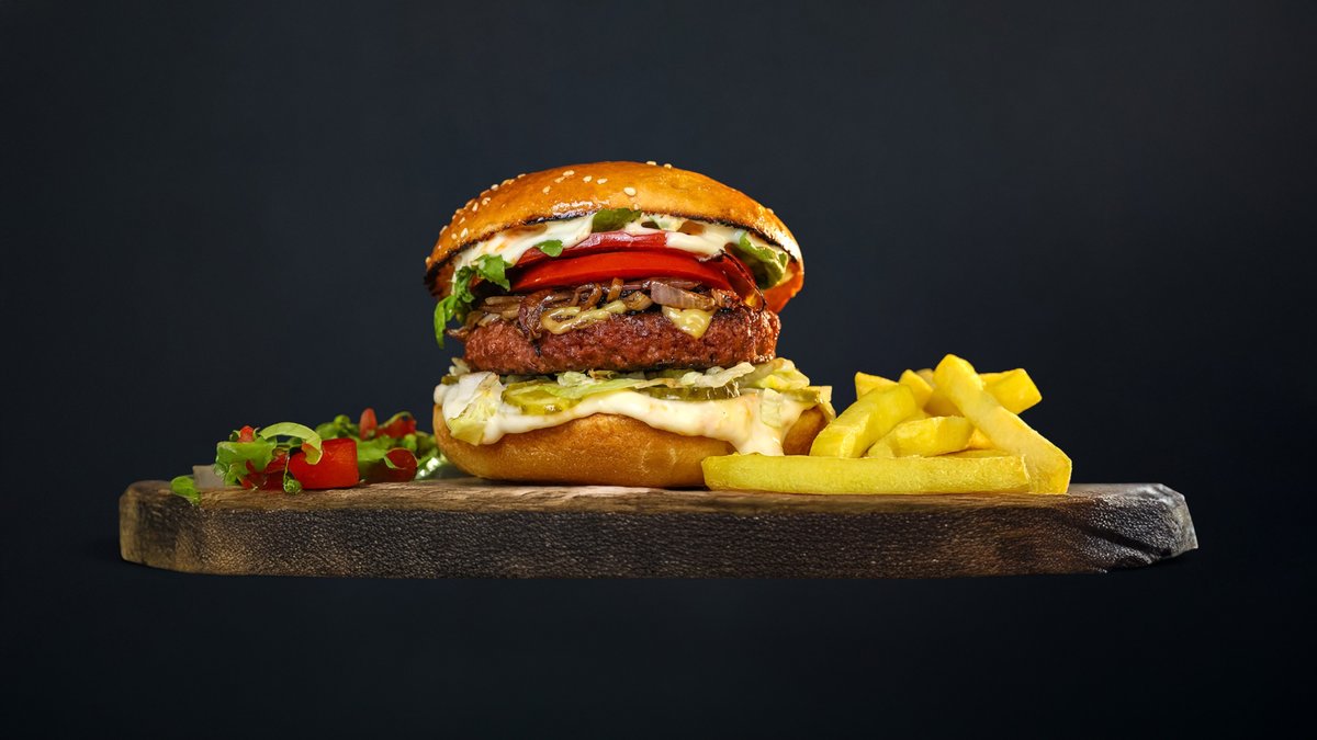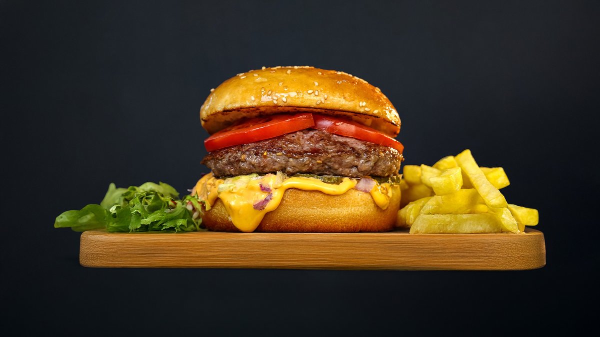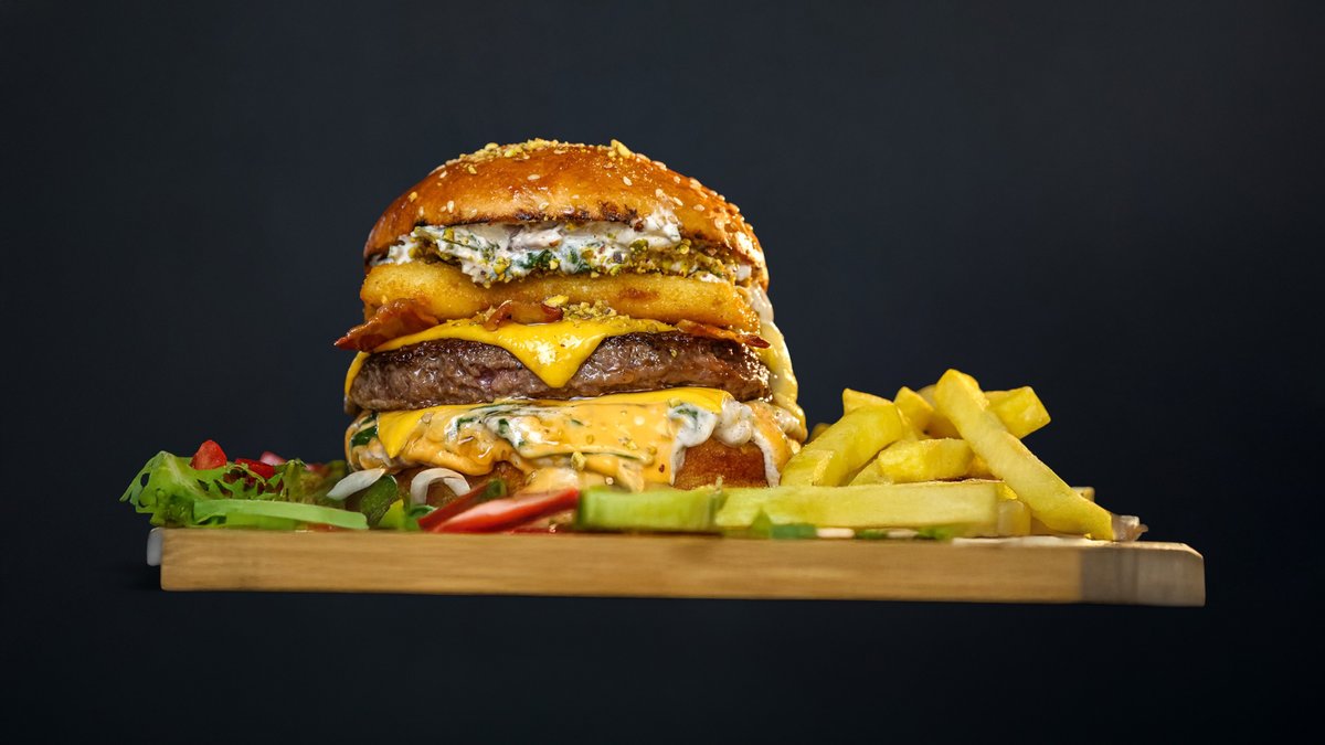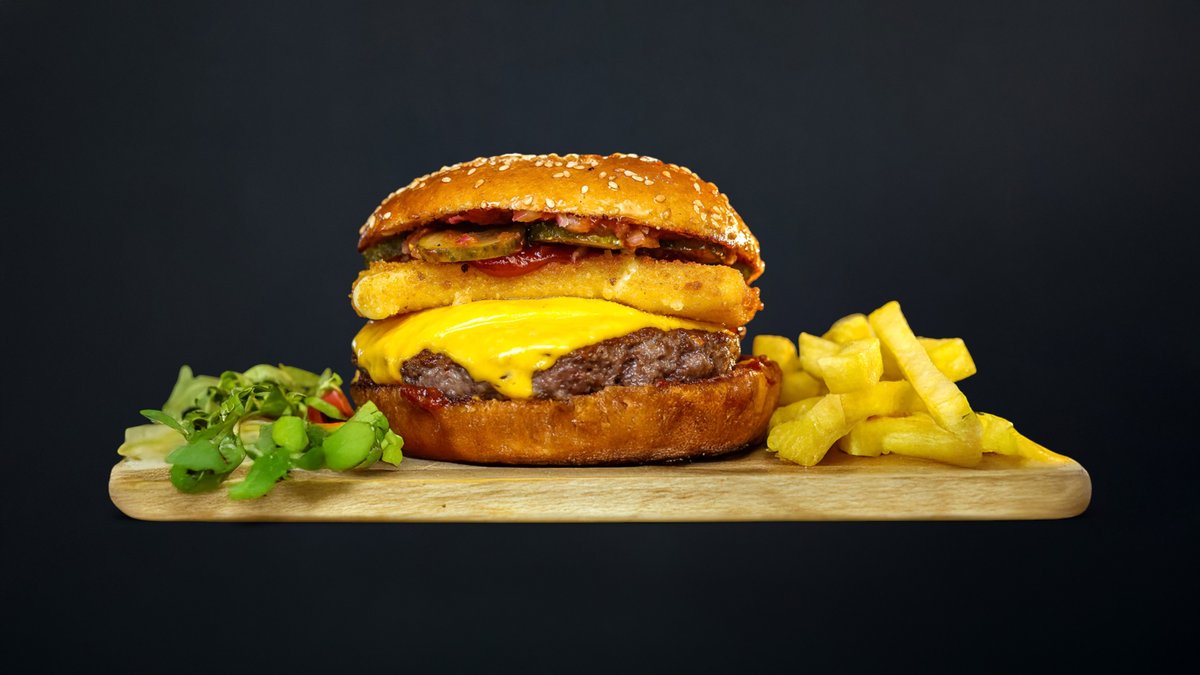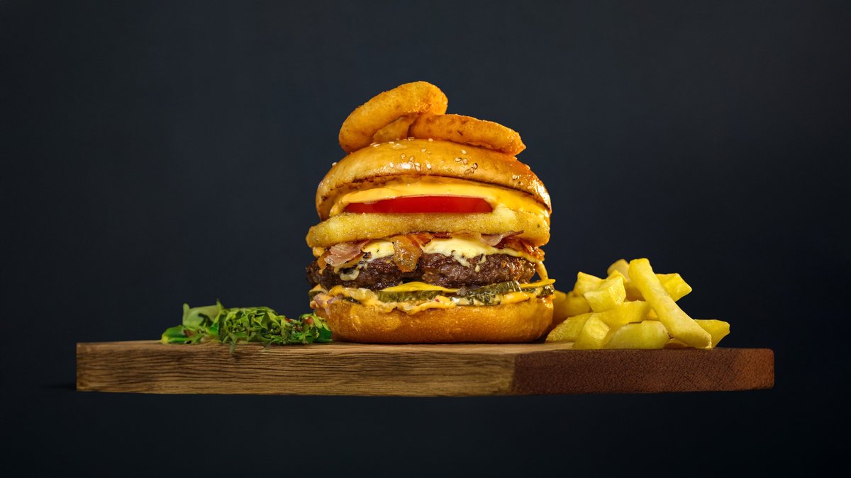 650 g, 100% Premium juneći burger 200 g, crispy mozzarella, crveni sos, dupli topljeni čedar, crveni luk, kiseli krastavci, pomfrit 200gr