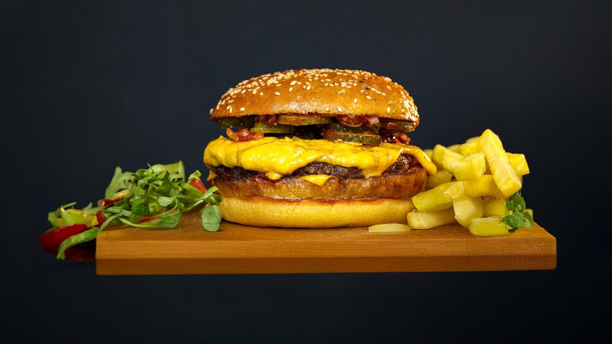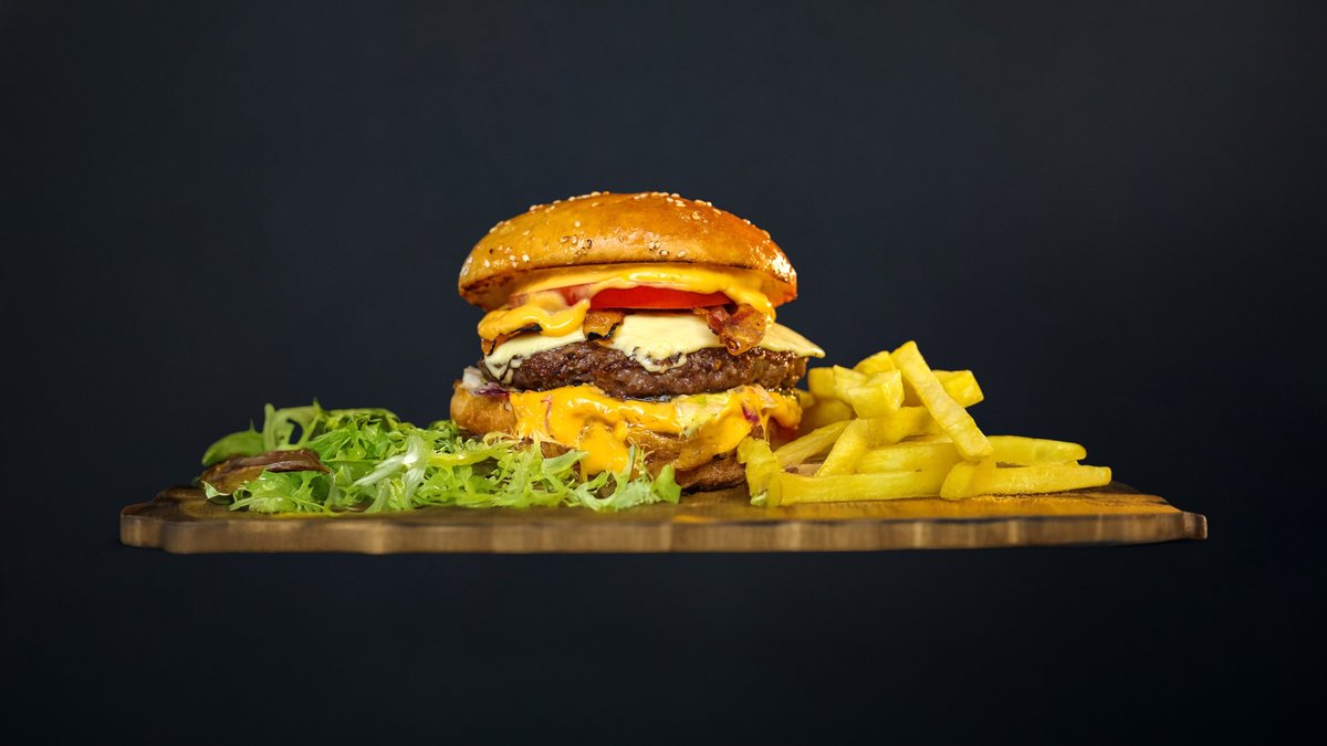 550 g, 100% premium juneći burger 200 g, crveni sos, dupli topljeni čedar, crveni luk, kiseli krastavci, pomfrit 200gr