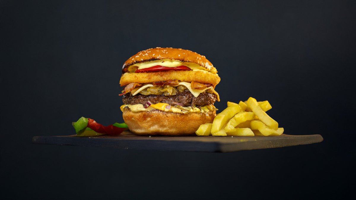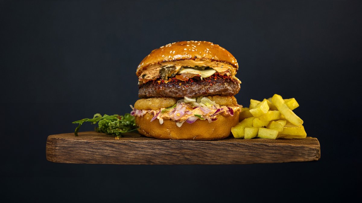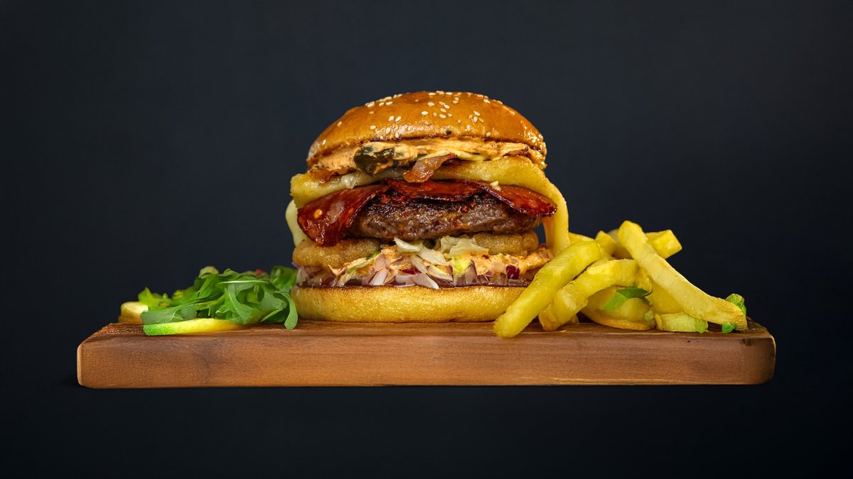 630 g, 100% Premium juneći burger 200 g, pečen na tucanoj paprici, kulen, halapenjo, crispy mozzarella, chilli, domaći urnebes, topljena gauda, pančeta, crveni luk, iceberg kolutići pohovanog luka, pomfrit 200gr.