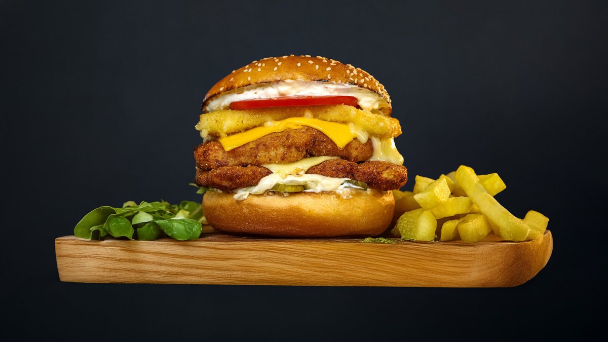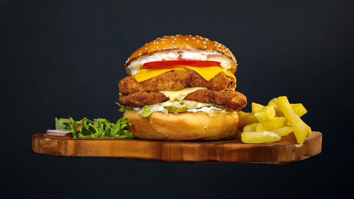 700 g, Crispy piletina panko prezlama 200gr, crispy mozzarella, dupli topljeni čedar, Philadelphia-Mayo sos, kiseli krastavčići, iceberg, paradajz, pomfrit 200gr