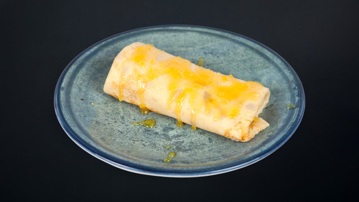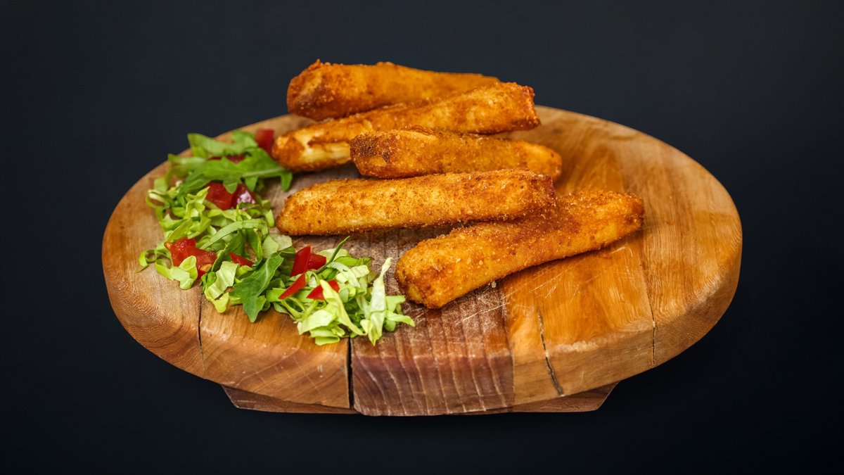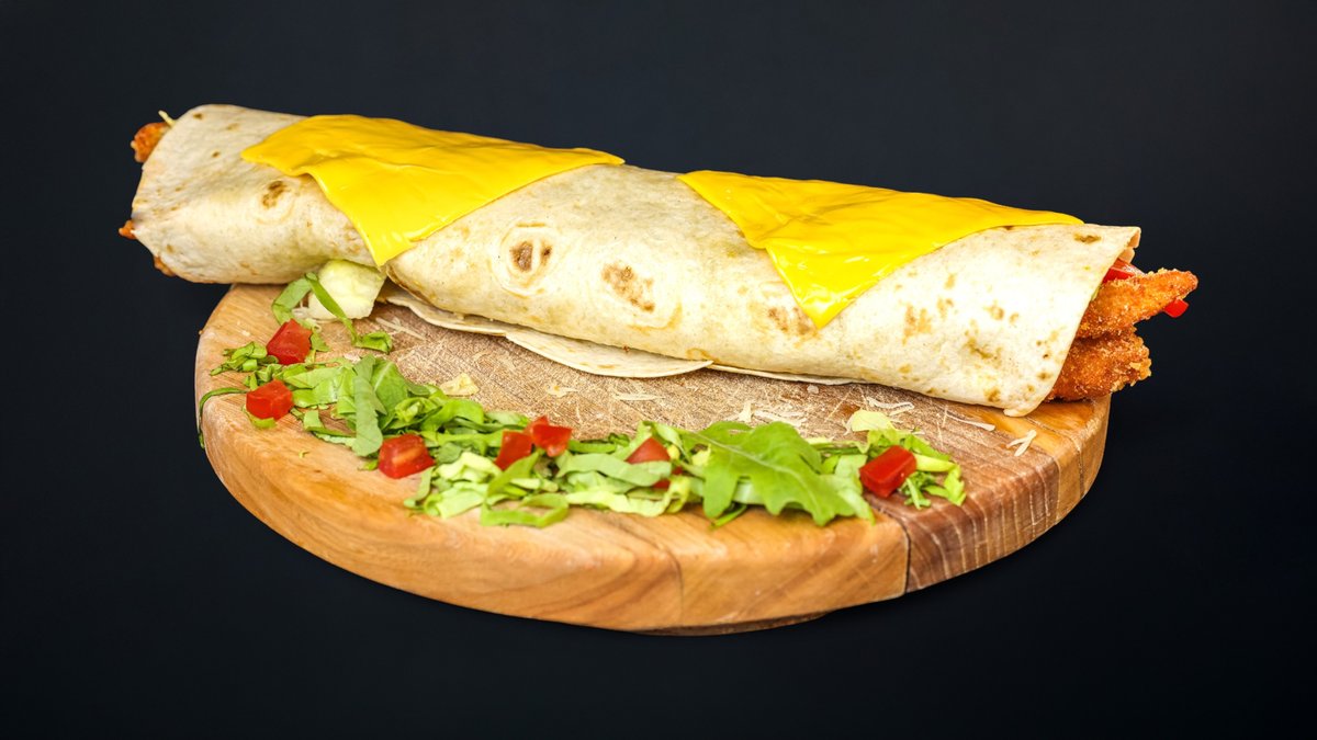 Crispy pileći štapići u panko prezlama, topljeni čedar, Philadelphia-Mayo sos, iceberg, paradajz, crveni luk.