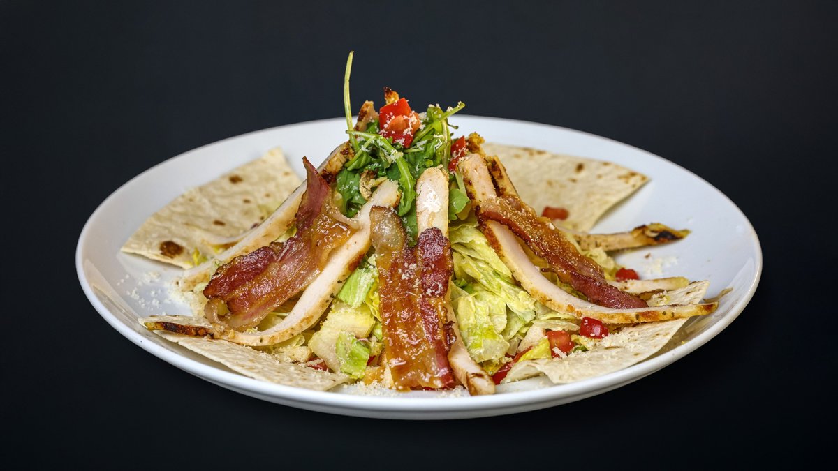 Grilovana piletina, grilovana pančeta, iceberg salata, dresing, listići mozzarelle, kockice paradajza, rukola, krutoni, parmezan