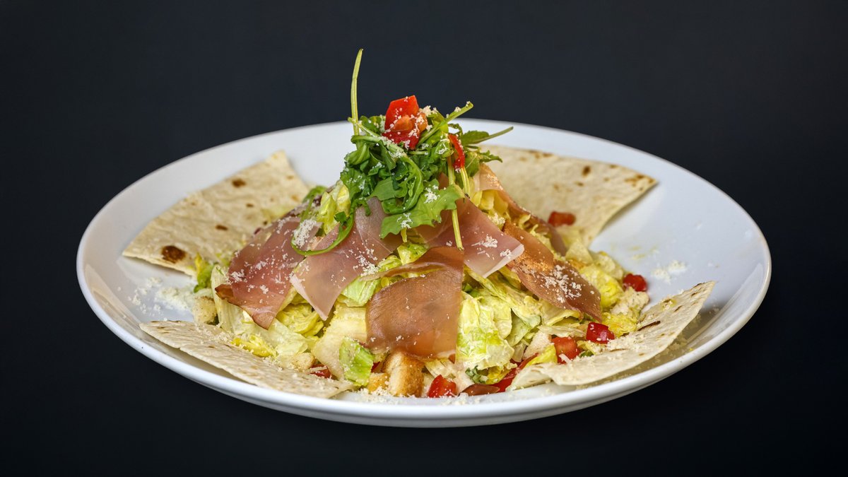 Pršuta, parmezan, miks zelenih salata, mozzarella listići, kockice paradajza, rukola, Burgerizza sos, krutoni, parmezan