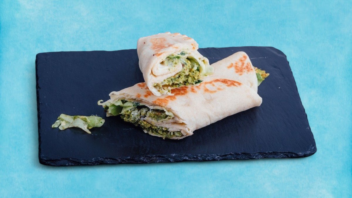 Pileća shawarma, falafel, humus, tahini, kornišoni, paradajz, pita hleb