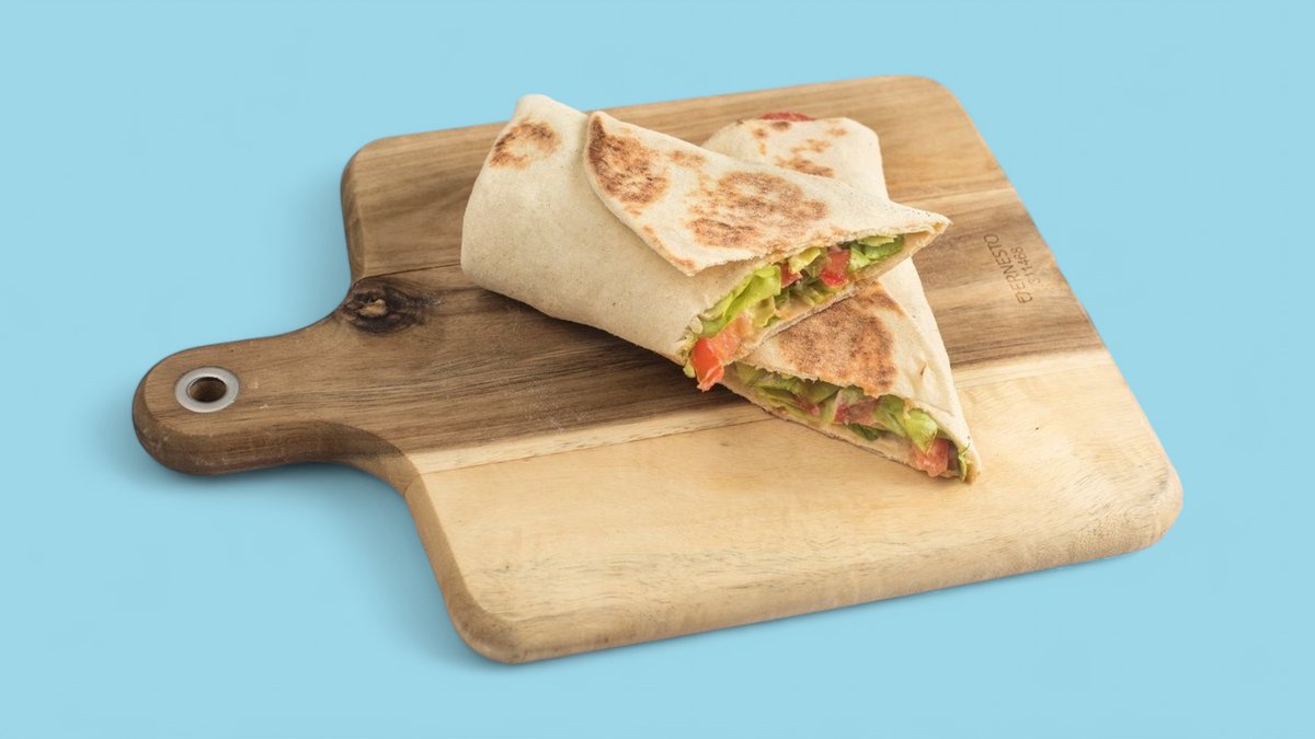 Pita hleb sa belim lukom, topljenimim sirom, mariniranom piletinom, coleslaw salatom i humusom