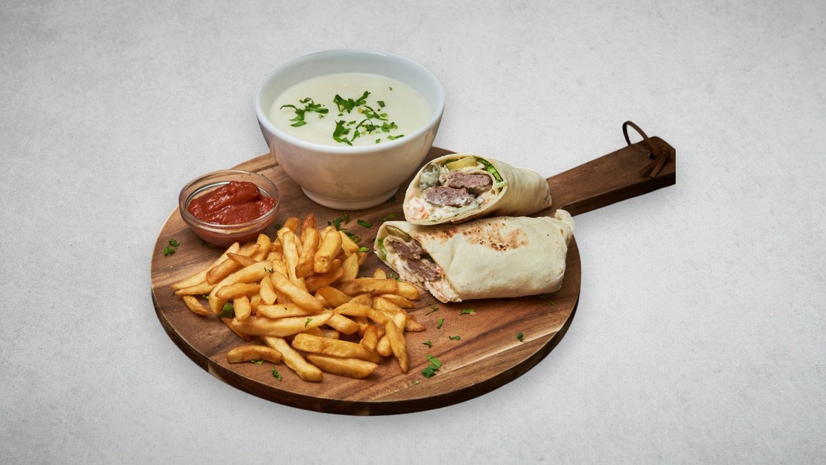 Libanski ćevap sa humusom i svežim povrćem u pita hlebu,uz prilog začinjeni krompir i sos od paradajza i đumbira