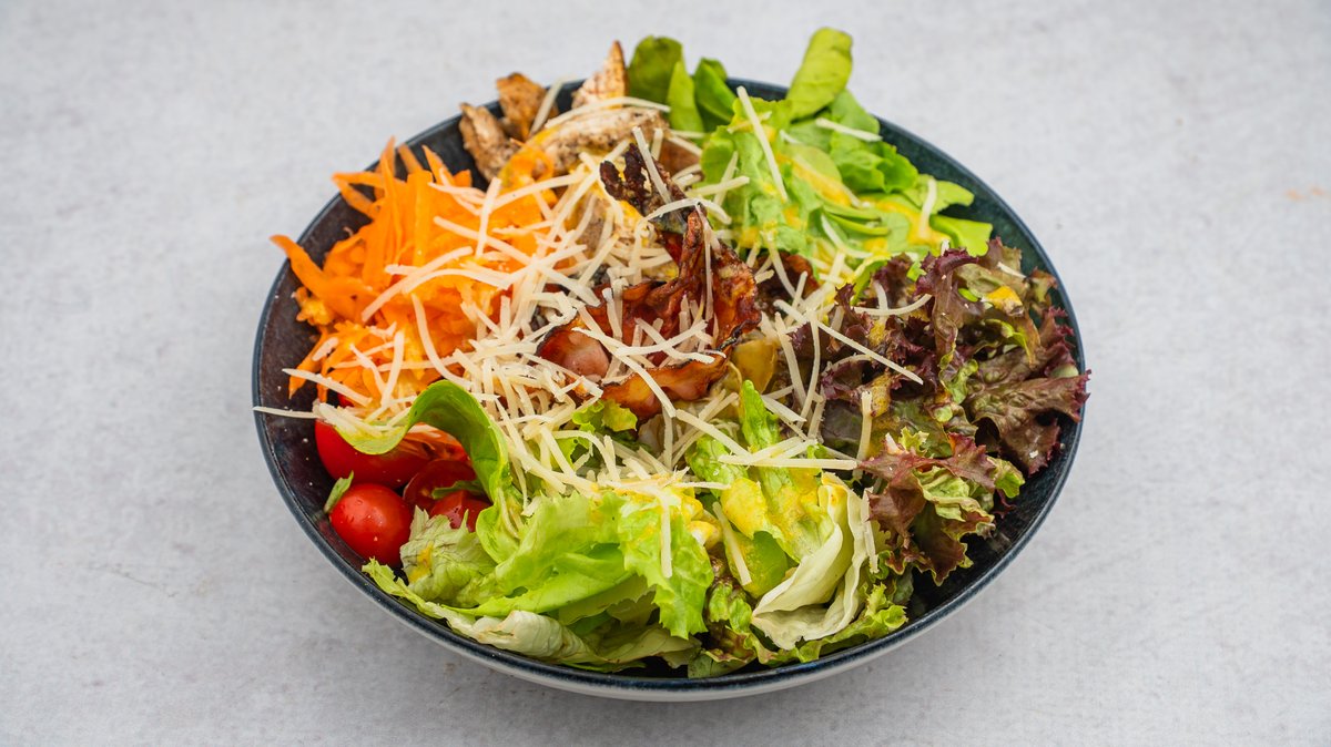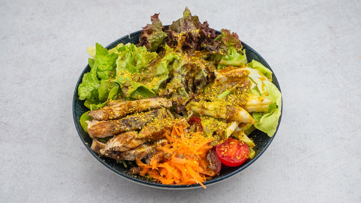 Pileći file, lola roso, lola bjonda, puterica, radić, baby spanać, šargarepa, hrskava pančeta sa senf med dresingom i parmezanom.