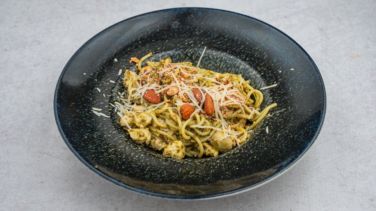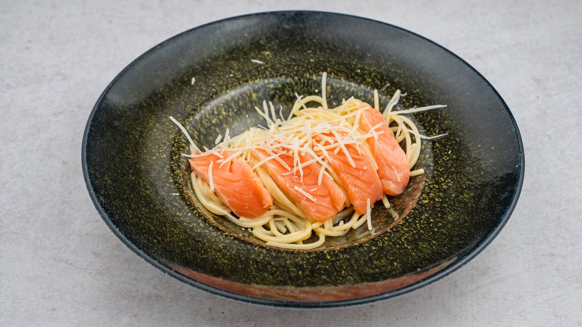 Aglio e olio pasta servirana sa dehidriranim slajsevima lososa