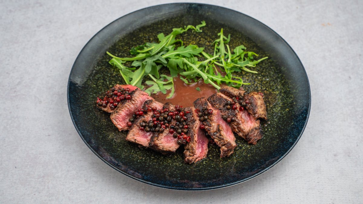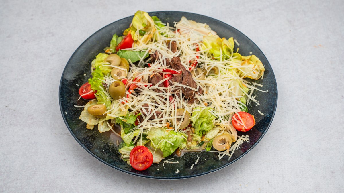 Miks zelenih salata sa maslinama i čerijem, sotirani biftek sa paprikom u kremi od soja sosa.