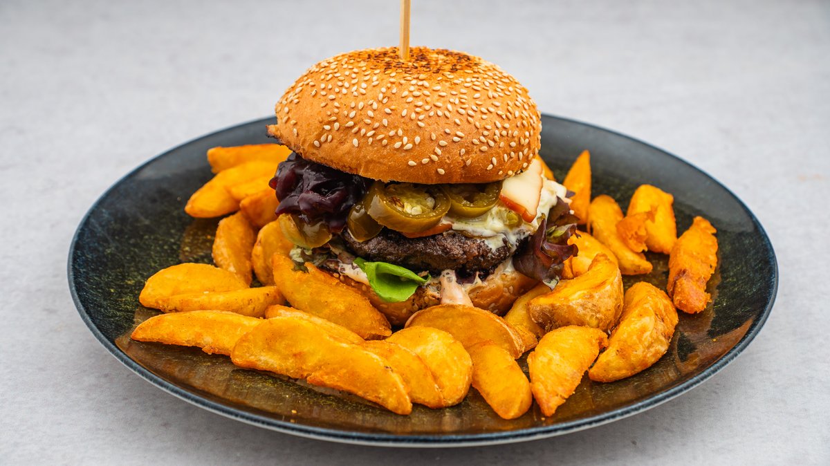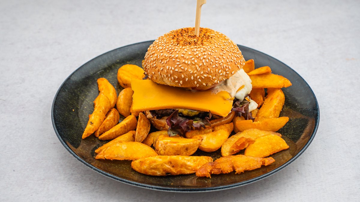 100% juneće meso, dresing, zelena salata, chedar sir, pančeta, paradajz i vedzđs krompir.