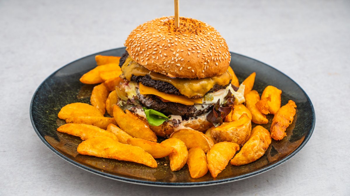 100% juneće meso x2, dresing, chedar sir, zelena salata, pančeta, paradajz i vedžis krompir