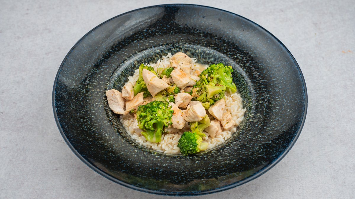 Sotirana piletina sa brokolijem u sosu od belog vina servirana na basmati pirinču