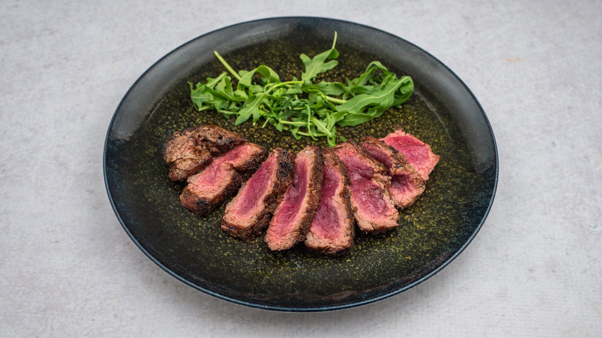 Sendvič od integralnog tosta, džem od luka, rukola, biftek i gauda.