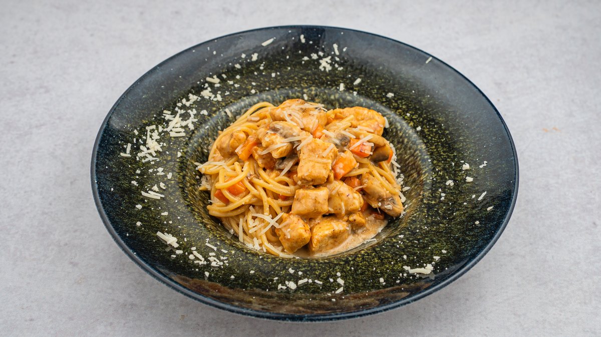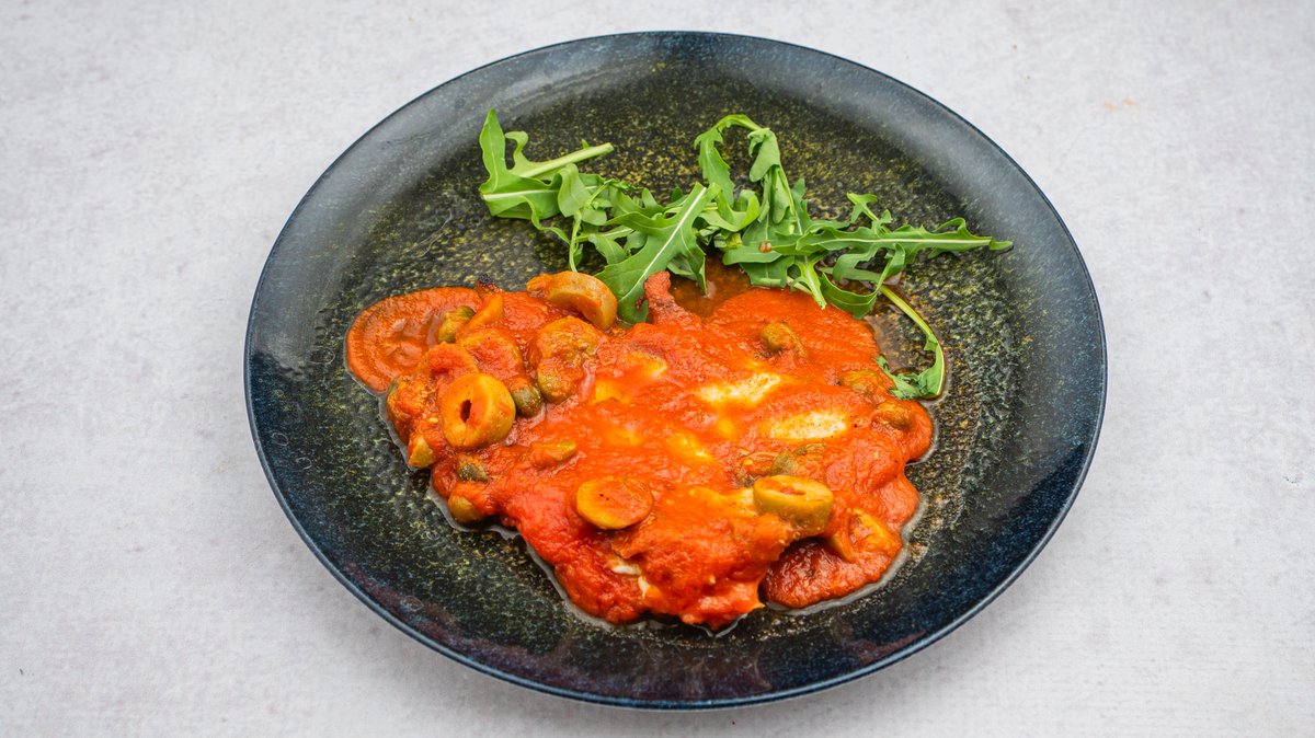 Pileći file u crvenom sosu obogaćenom maslinama, kaprom, šargarepom i peršunom. Prilog po izboru