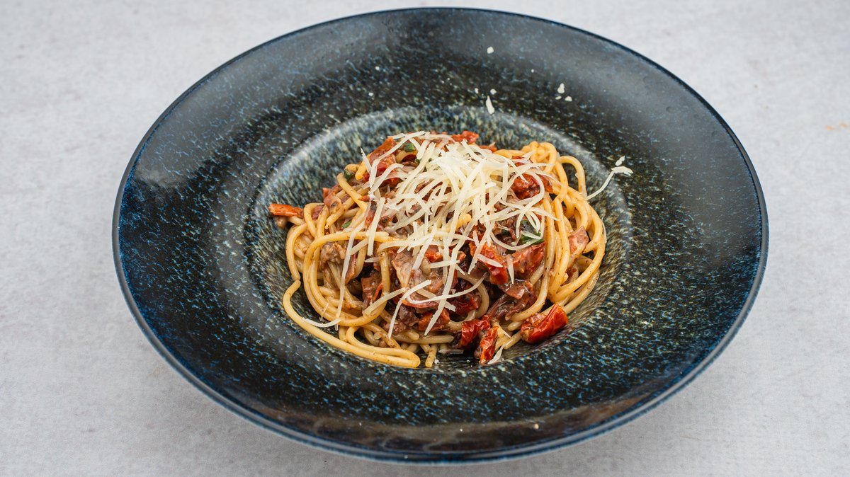 Pršuta, sušeni paradajz i seckani mladi luk u kremi od tartufate.