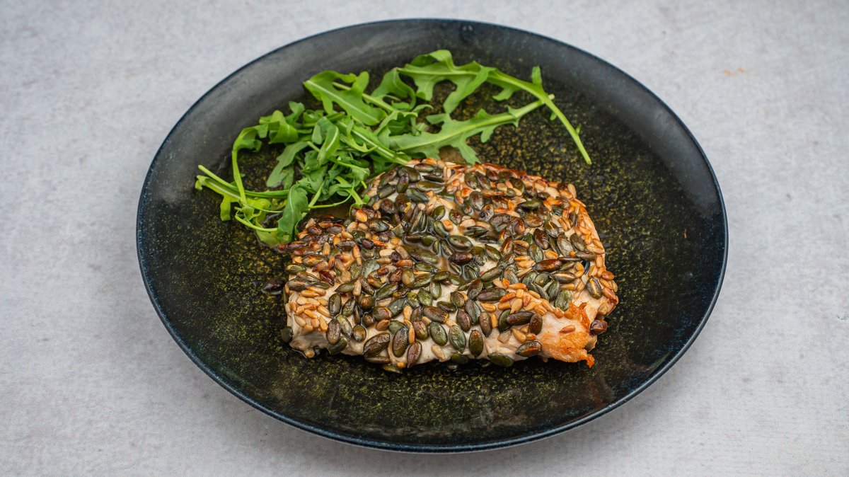 Ćureci file u semenkama bundeve, suncokreta, susama u sosu od belog vina i putera.. Prilog po izboru