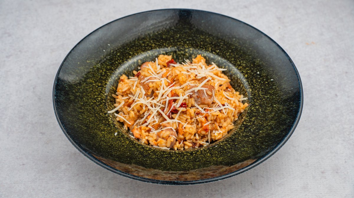 Rižoto sa tunom i lososom, sušenim paradajzom obogaćen šafranom.