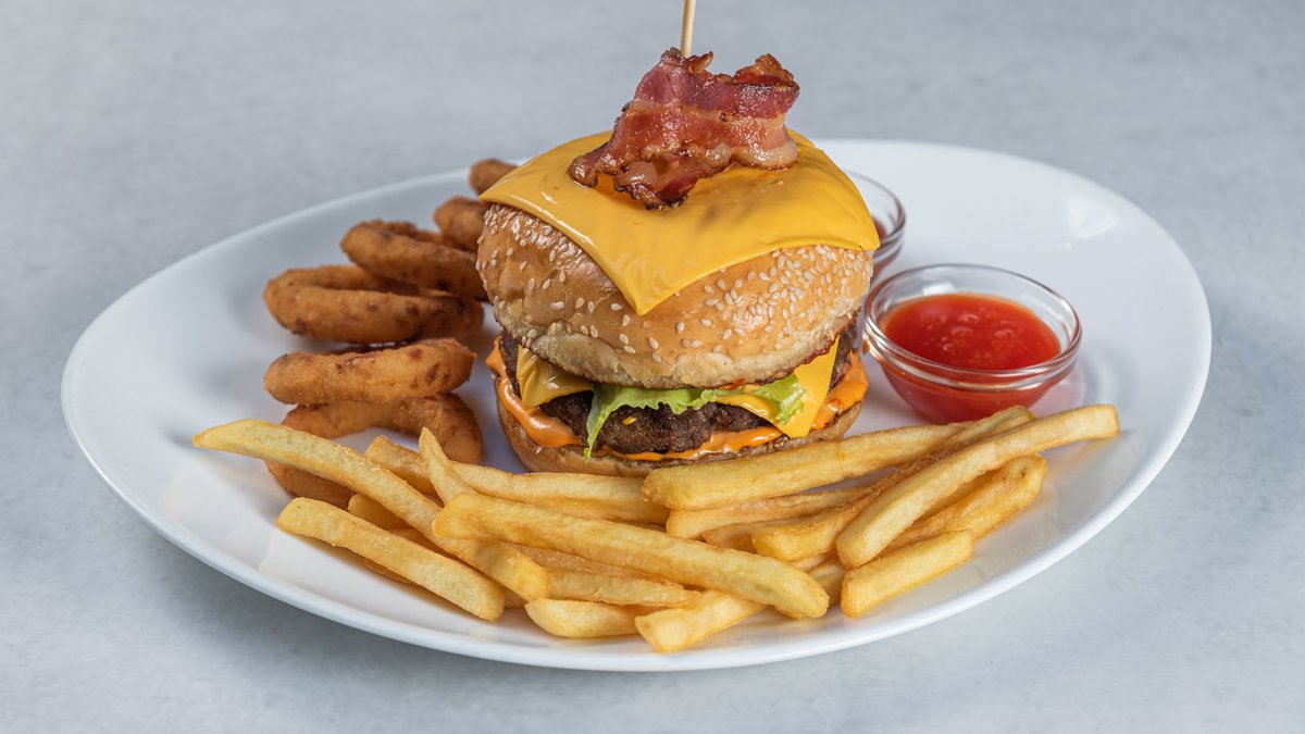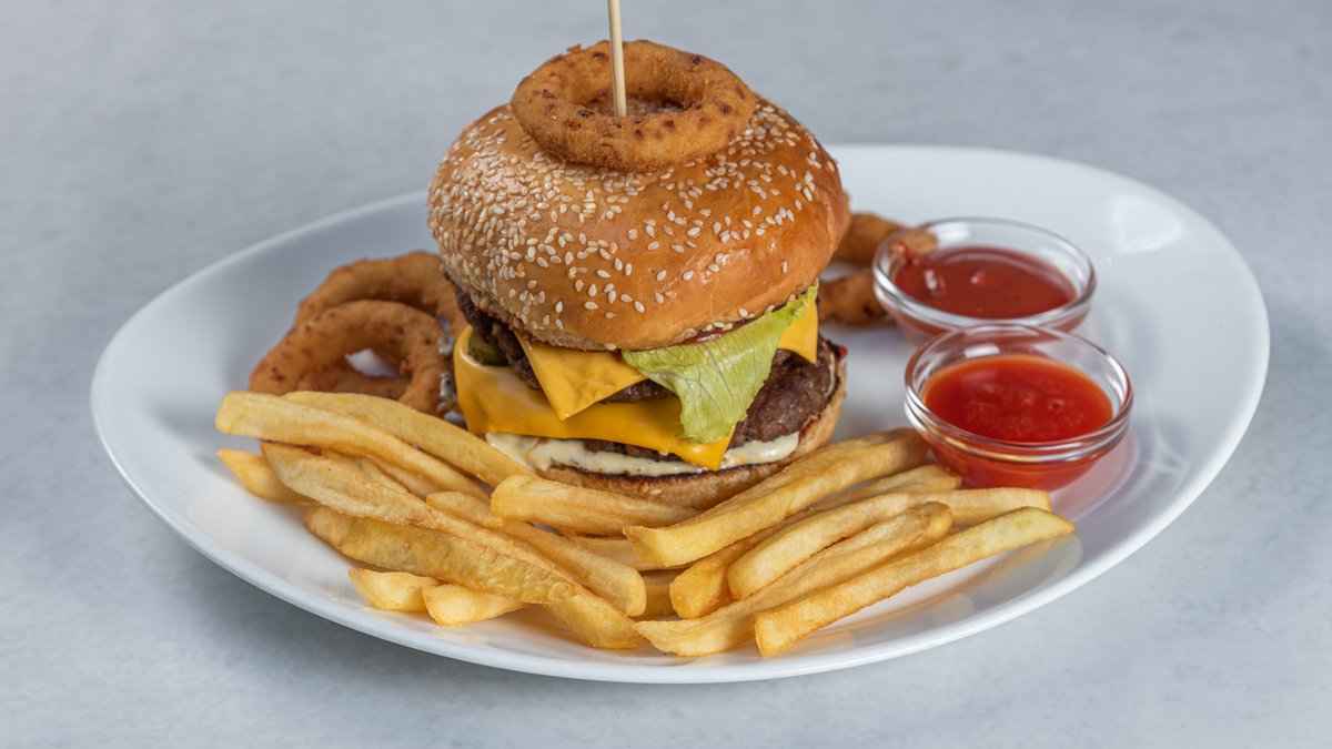 240g junećeg mesa, 100g pohovanog luka, 100g pomfrita , sir50g zemička, 20g salata, 2xsosevi