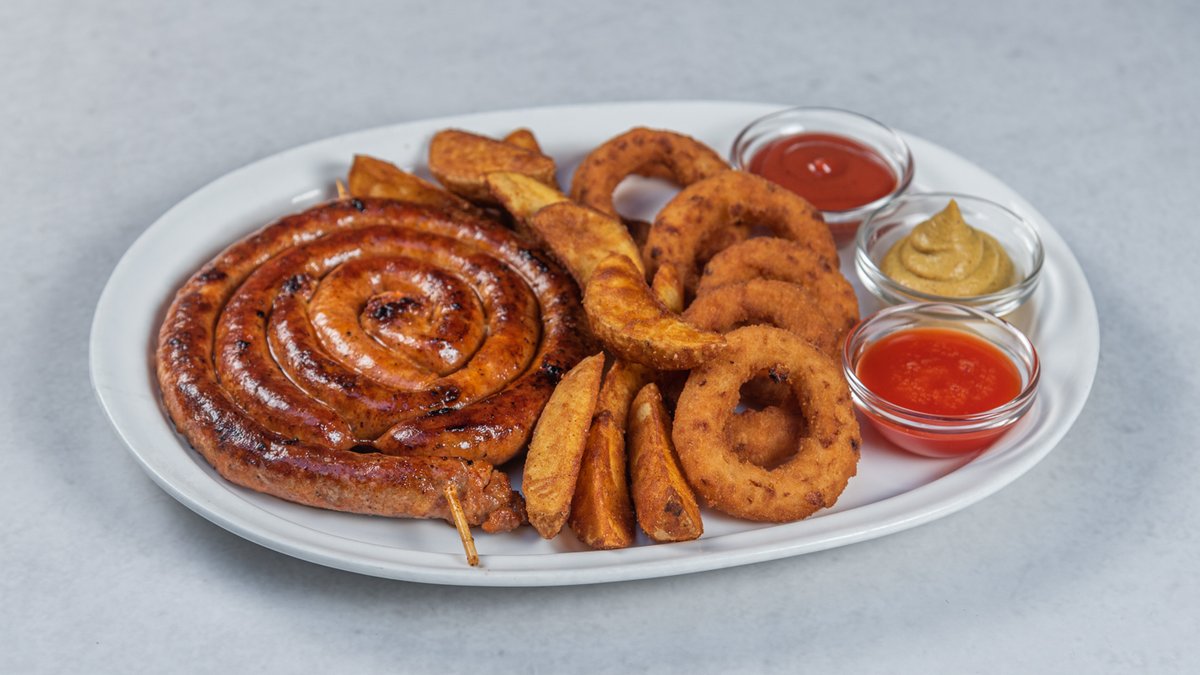 250g svinjskih rebara, 200g kobasica, 100g pohovanog luka, 100g krompirića, 3 sosa