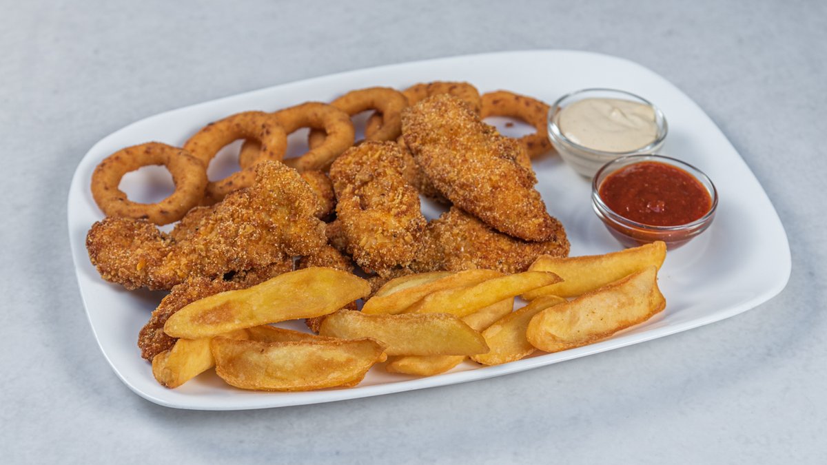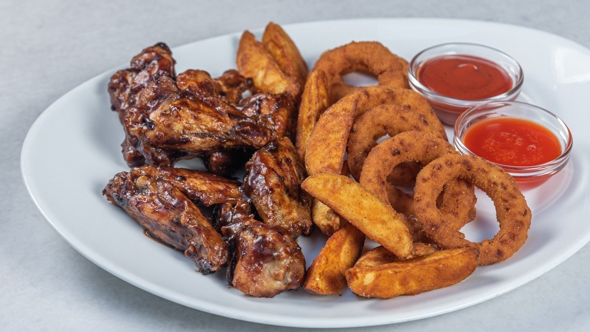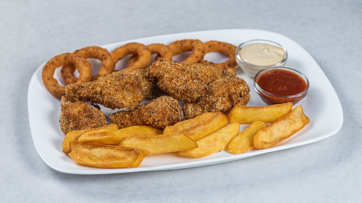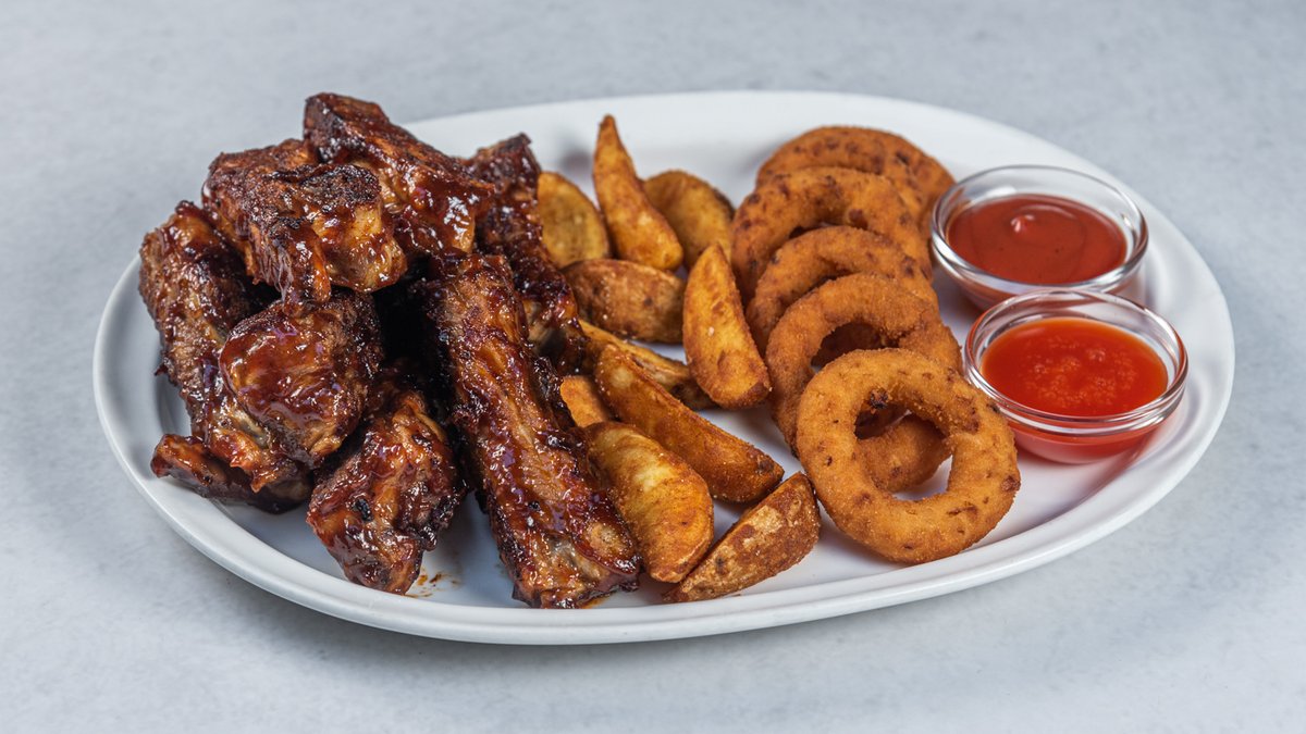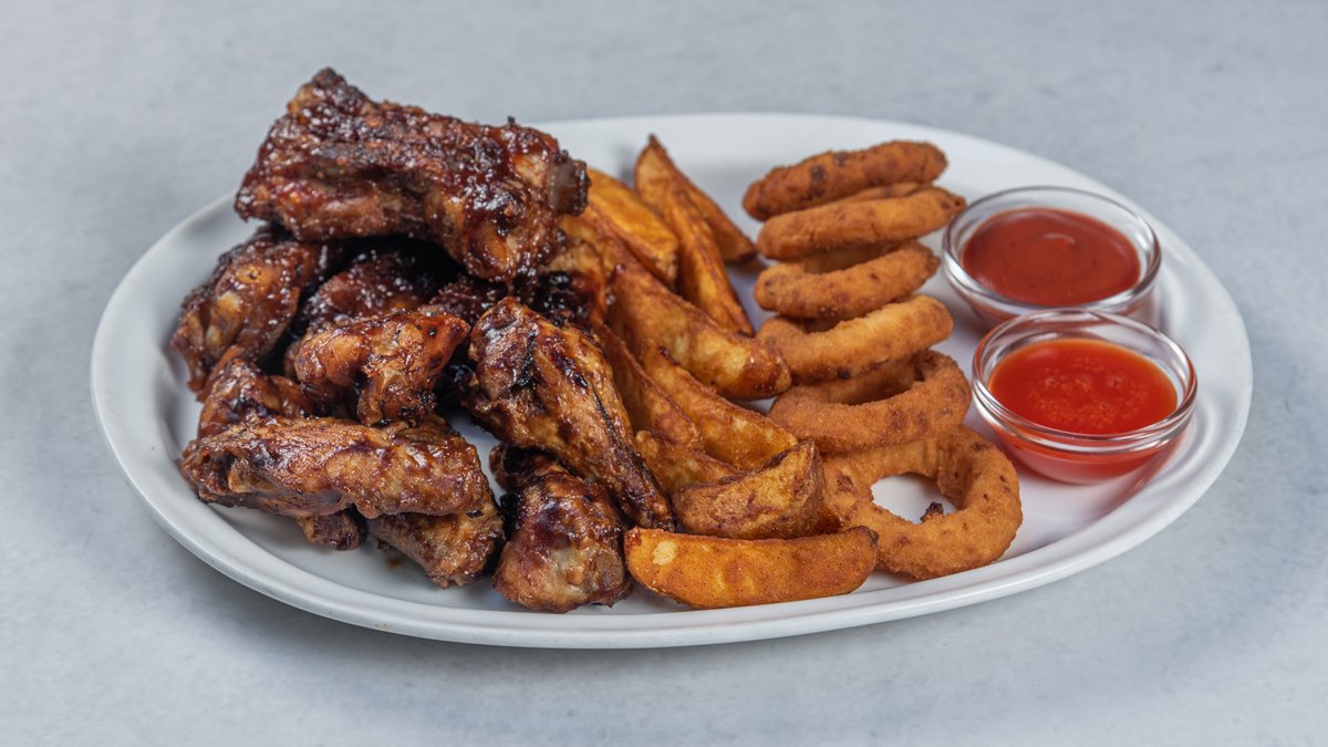 250g svinjskih rebaraca, 200g krilaca, 100g pohovanog luka, 100g krompirića, 2 sosa