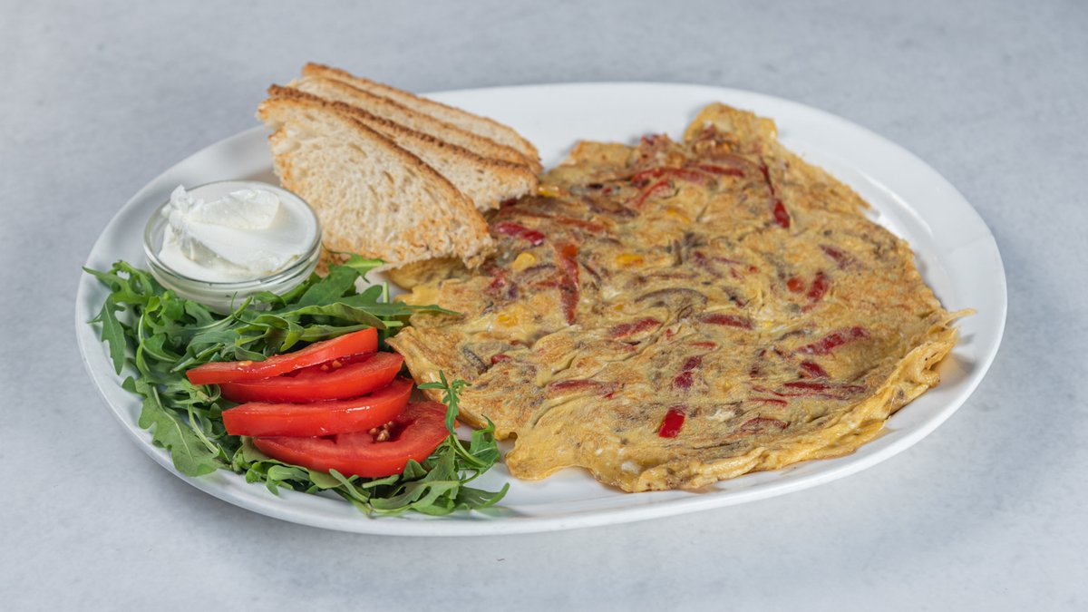 3 jaja, pančeta, sveža crvena paprika, 100g pomfrita, masline