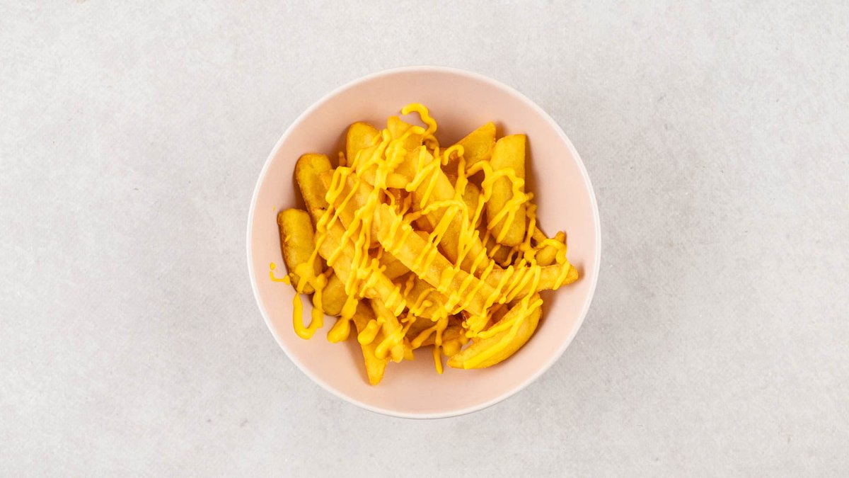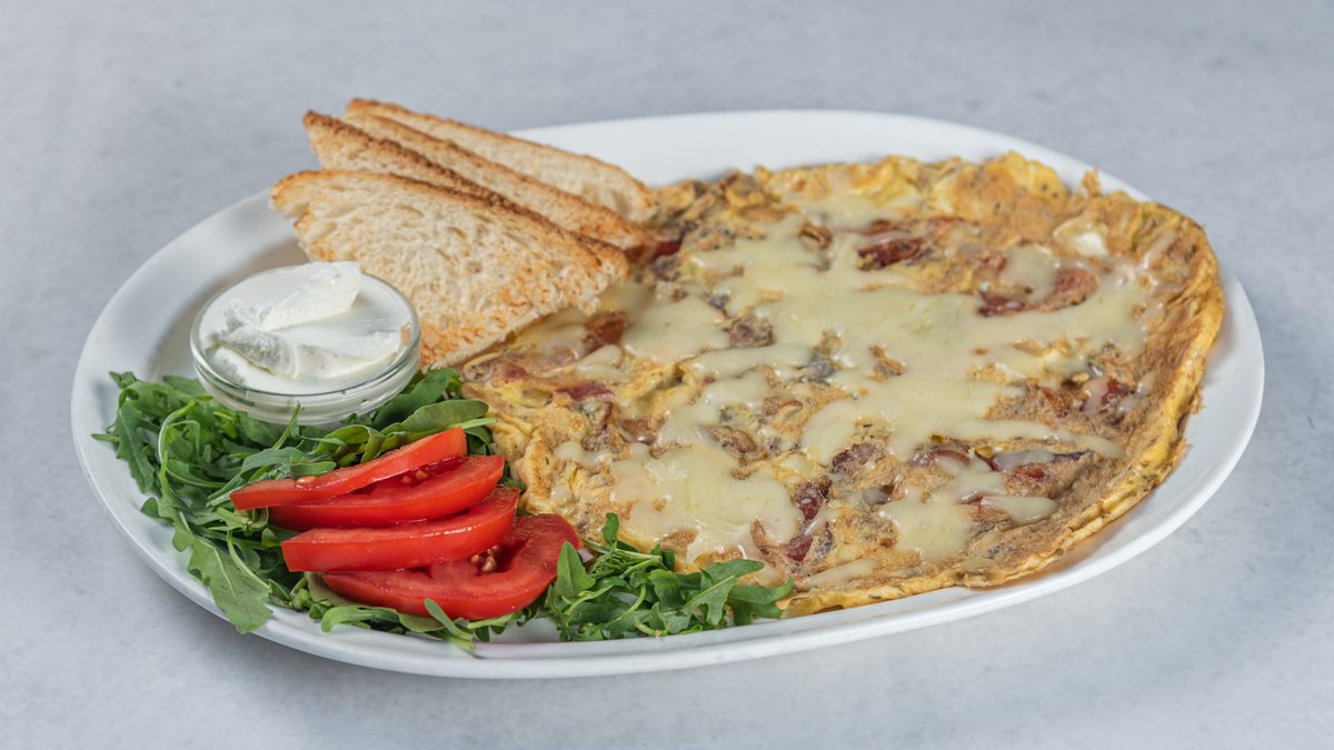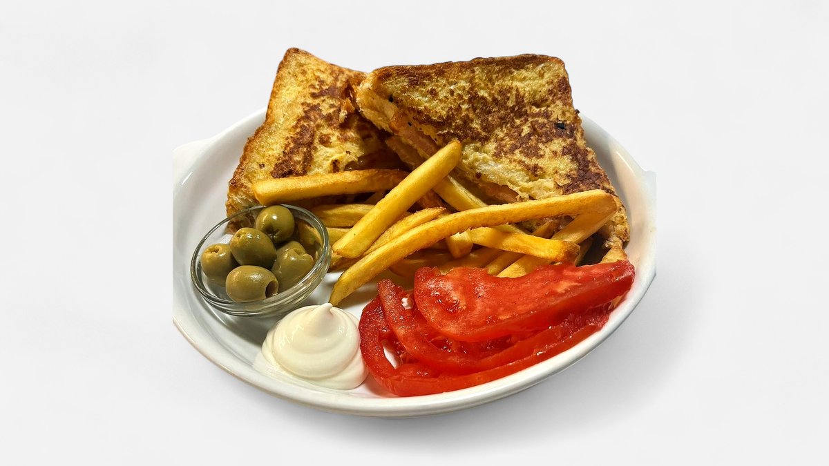 Kobasica, 2 jaja,kačkavalj, pomfrit, tost, senf, slatki sos