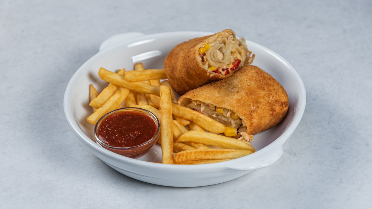 300g pohovanog pilećeg belog mesa, 100g pohovane parike, 100g kromirića, 2 sosa