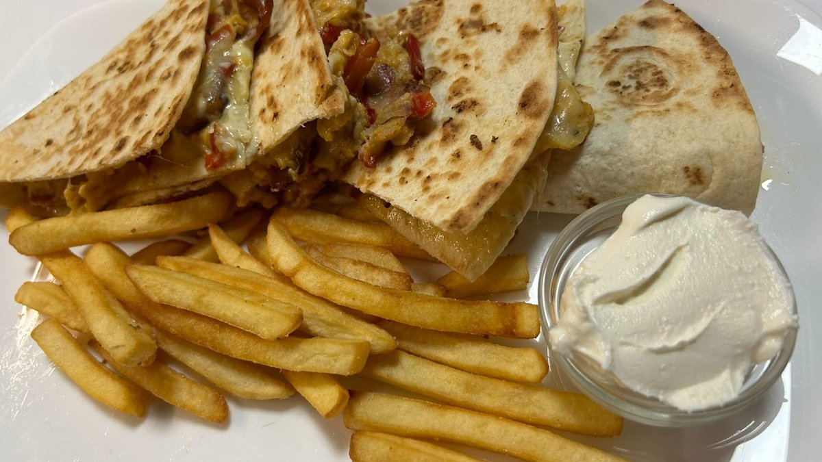 Tortilja, juneće meso, pasulj, pomfrit, sir, sos