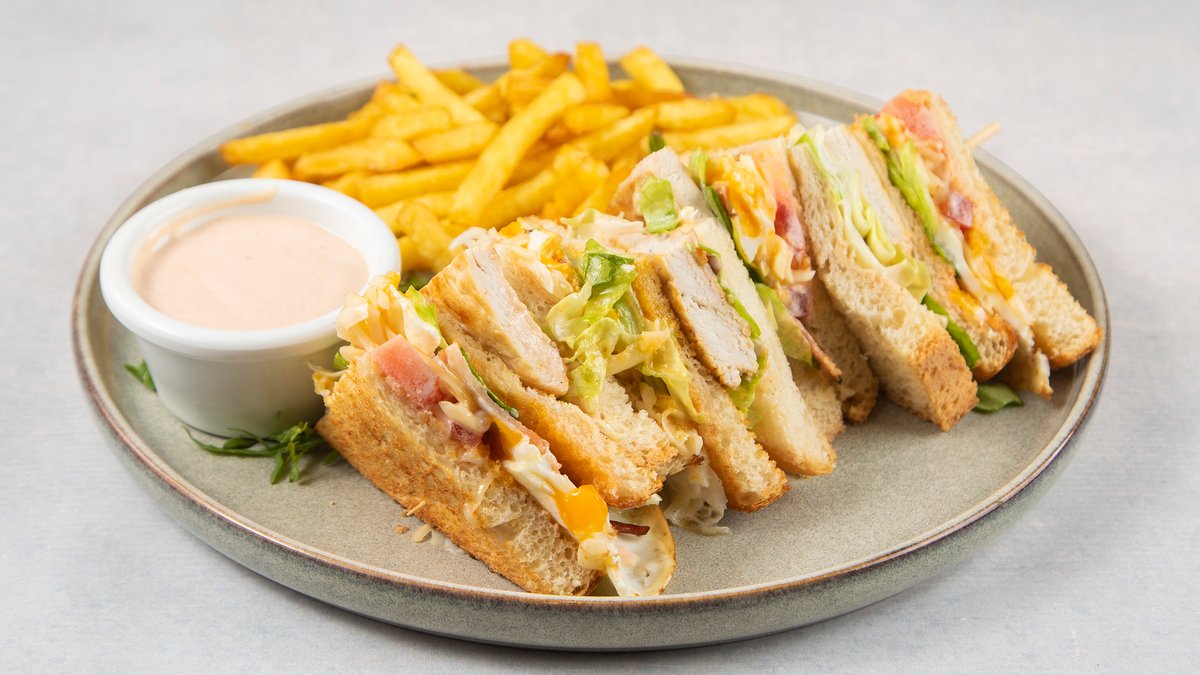 Tost, tartar sos, pileći file, jaje, slanina, paradajz, zlena salata, pomfrit