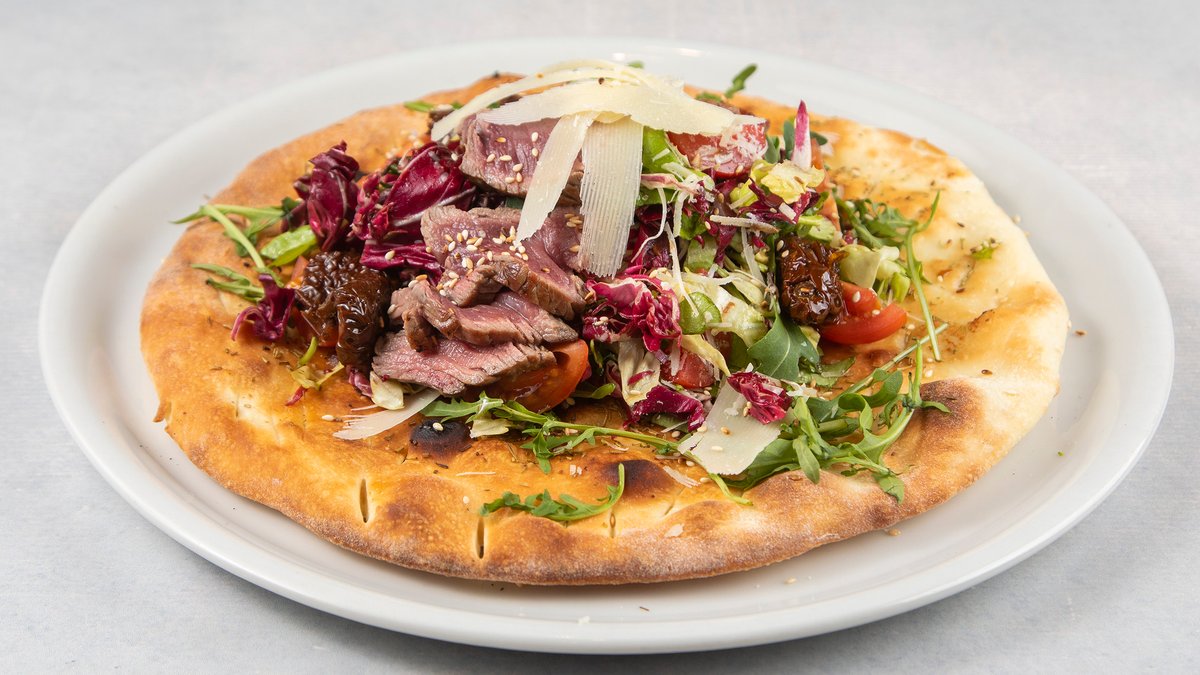 Biftek, fokaća, mix zelenih, sušeni paradajz, parmezan, susam, balsamico dressing