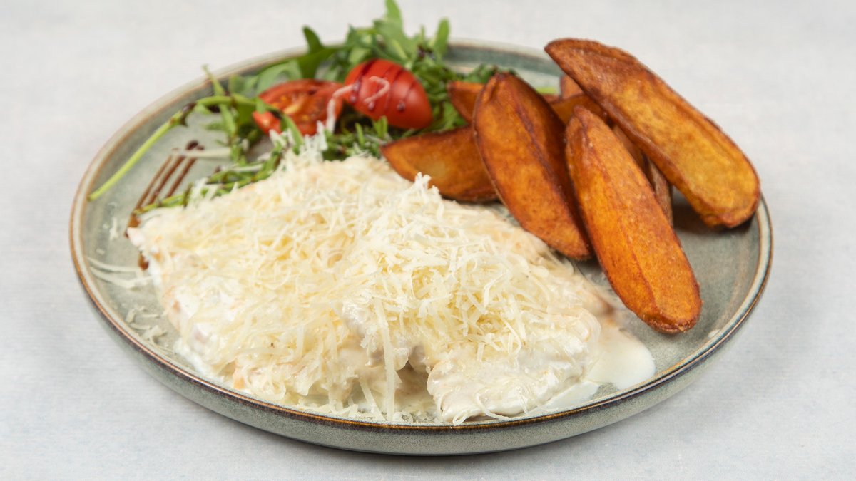 Piletina, gorgonzola, čedar, kačkavalj, parmezan, domaći začinjeni krompir, mix zelenih