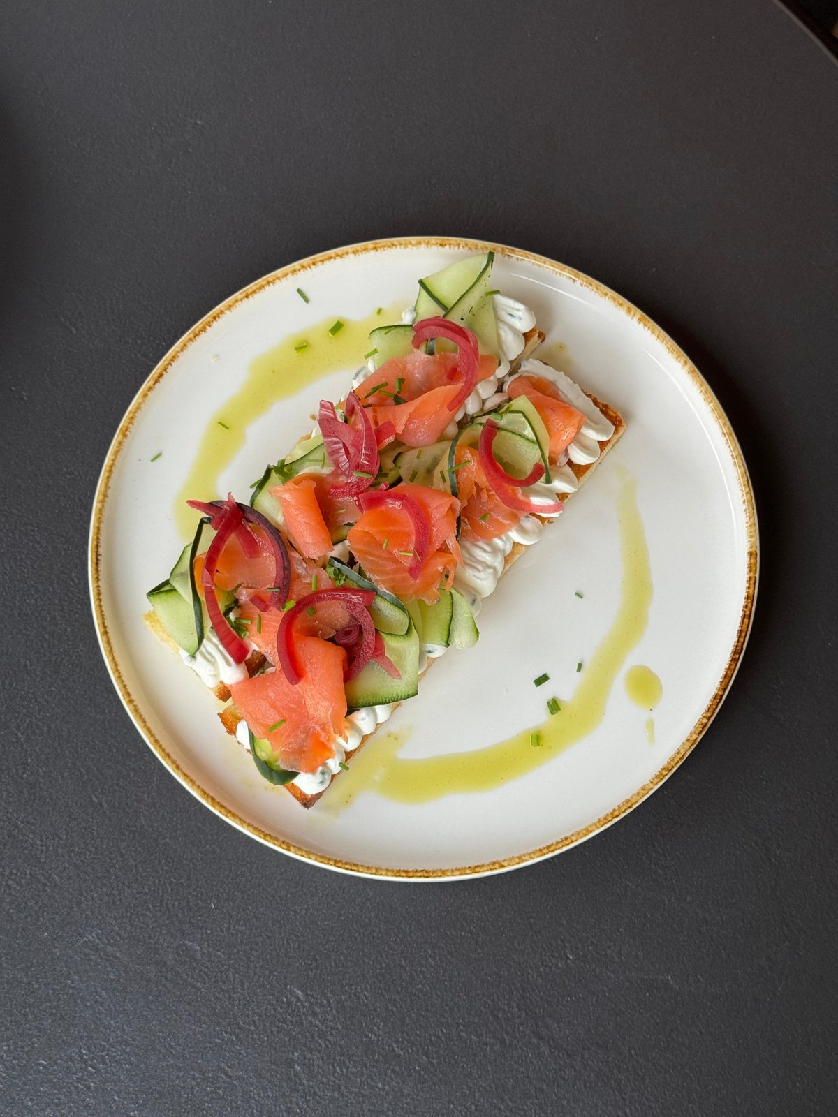 Tostirani brioš hleb sa krem freš namazom, dimljenim lososom, tanko sečeni krastavac i kiseli luk.