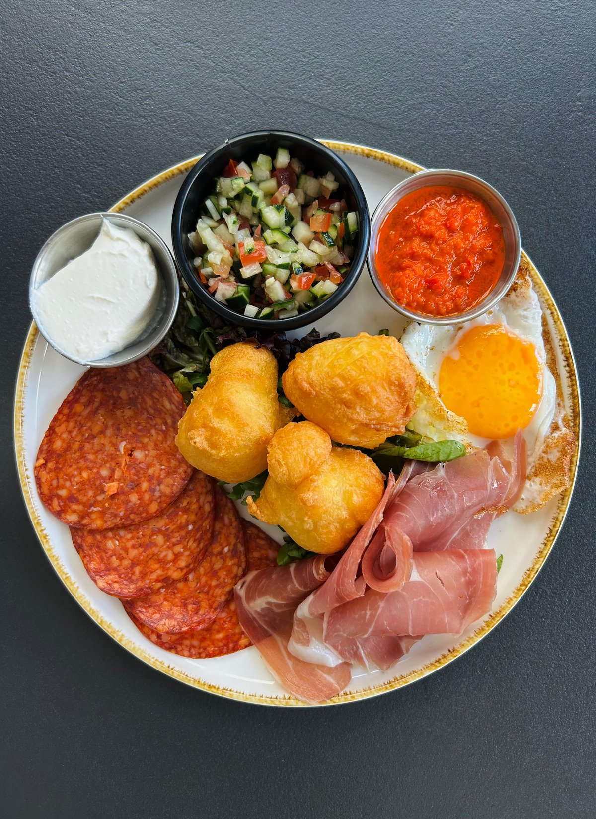 Njeguški pršut, domaći kulen, uštipci, jaje na oko, srpska salata, ajvar, krem sir.