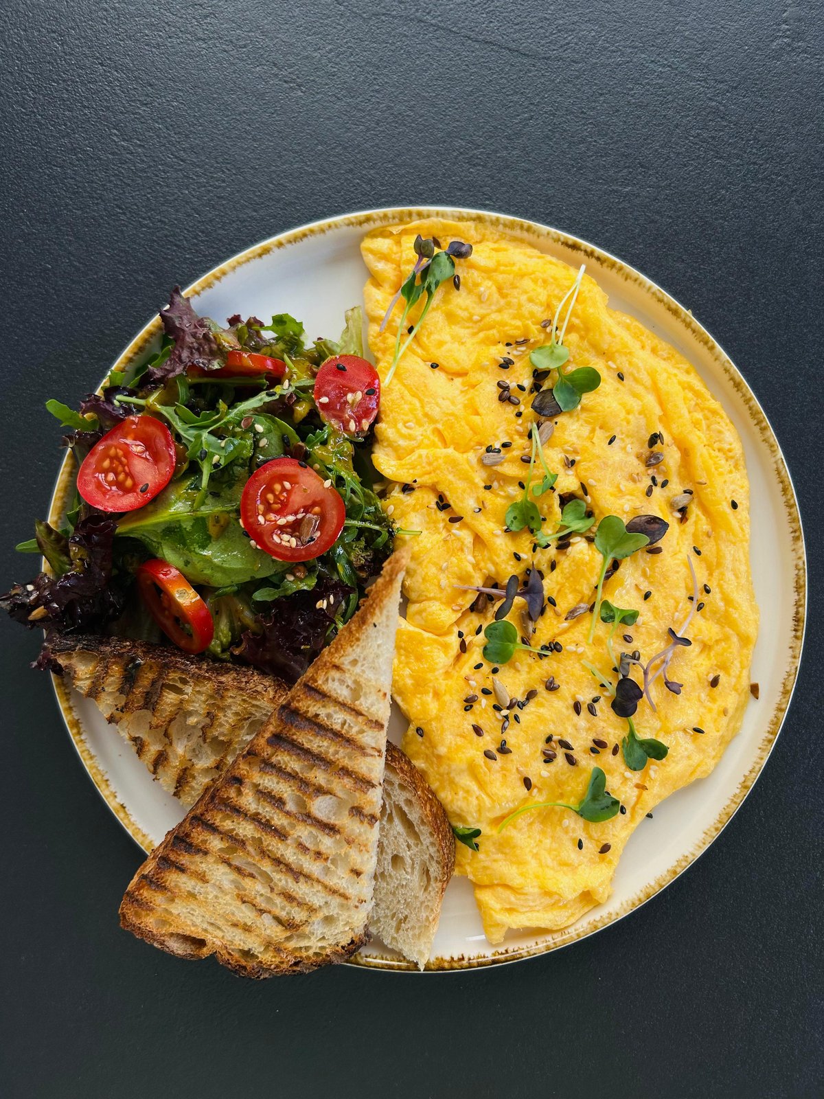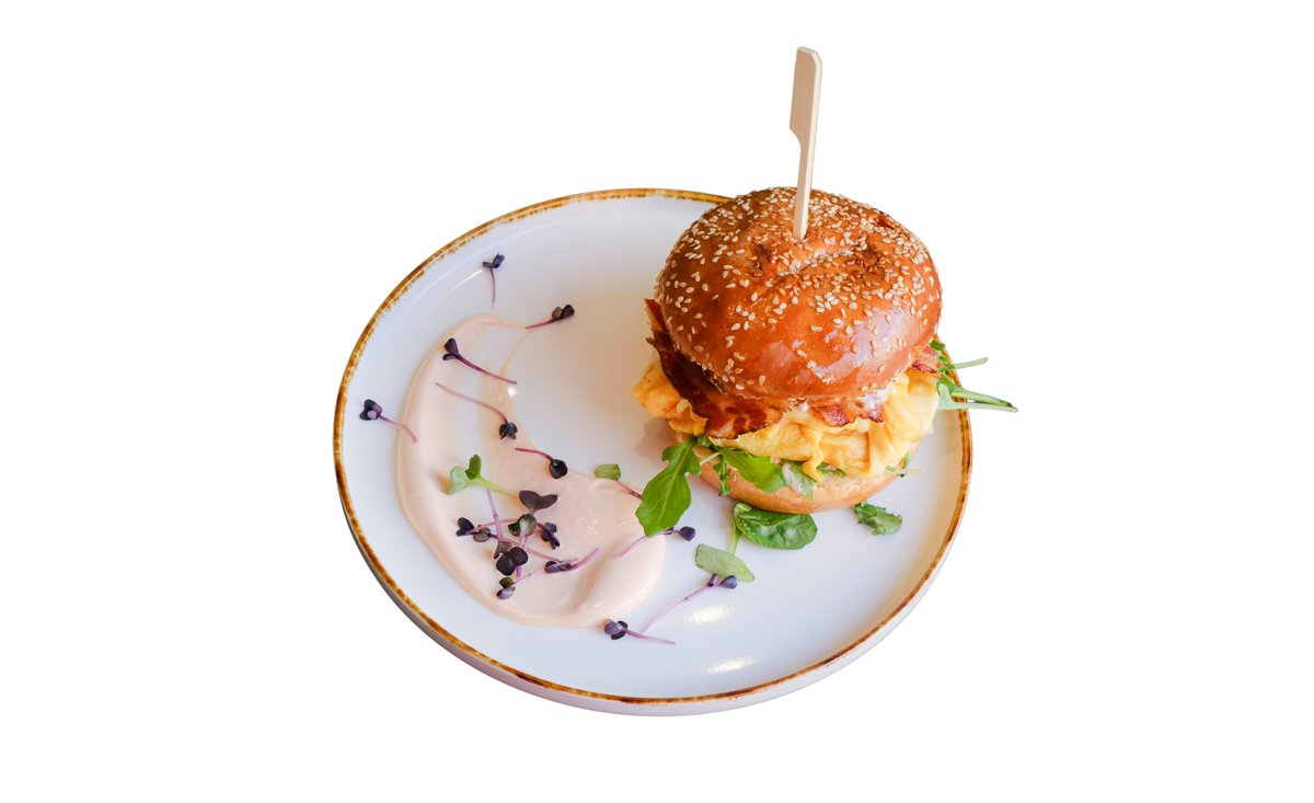 Hrskavi brioš tost sendvič sa omletom, slaninom, domaćim burger sosom, sirom i salatom.