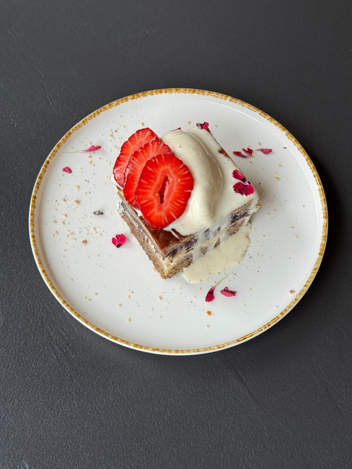 Domaći kolač sa jabukama i makom i sladoled vanila.